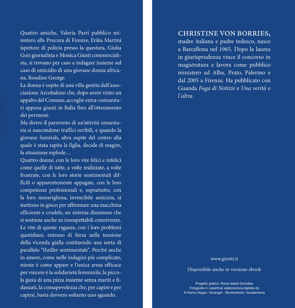 Quattro amiche, Valeria Parri pubblico ministero alla Procura di Firenze, Erika Martini ispettore di polizia presso la questura, Giulia Gori giornalista e Monica Giusti commercialista, si trovano per caso a indagare insieme sul caso di omicidio di una giovane donna africana, Rosaline George. La donna è ospite di una villa gestita dall'associazione Arcobaleno che, dopo avere vinto un appalto del Comune, accoglie extra-comunitari appena giunti in Italia fino all'ottenimento dei permessi. Ma dietro il paravento di un'attività umanitaria si nascondono traffici orribili, e quando la giovane Samirah, altra ospite del centro alla quale è stata rapita la figlia, decide di reagire, la situazione esplode... Quattro donne, con le loro vite felici e infelici come quelle di tutte, a volte realizzate, a volte frustrate, con le loro storie sentimentali difficili o apparentemente appagate, con le loro competenze professionali e, soprattutto, con la loro meravigliosa, invincibile amicizia, si mettono in gioco per affrontare una macchina efficiente e crudele, un sistema disumano che si sostiene anche su insospettabili connivenze. Le vite di queste ragazze, con i loro problemi quotidiani, entrano di forza nella tensione della vicenda gialla costituendo una sorta di parallelo ''thriller sentimentale''. Perché anche in amore, come nelle indagini più complicate, niente è come appare e l'unica arma efficace per vincere è la solidarietà femminile, la piccola gioia di una pizza insieme senza mariti e fidanzati, la consapevolezza che, per capire e per capirsi, basta davvero soltanto uno sguardo.