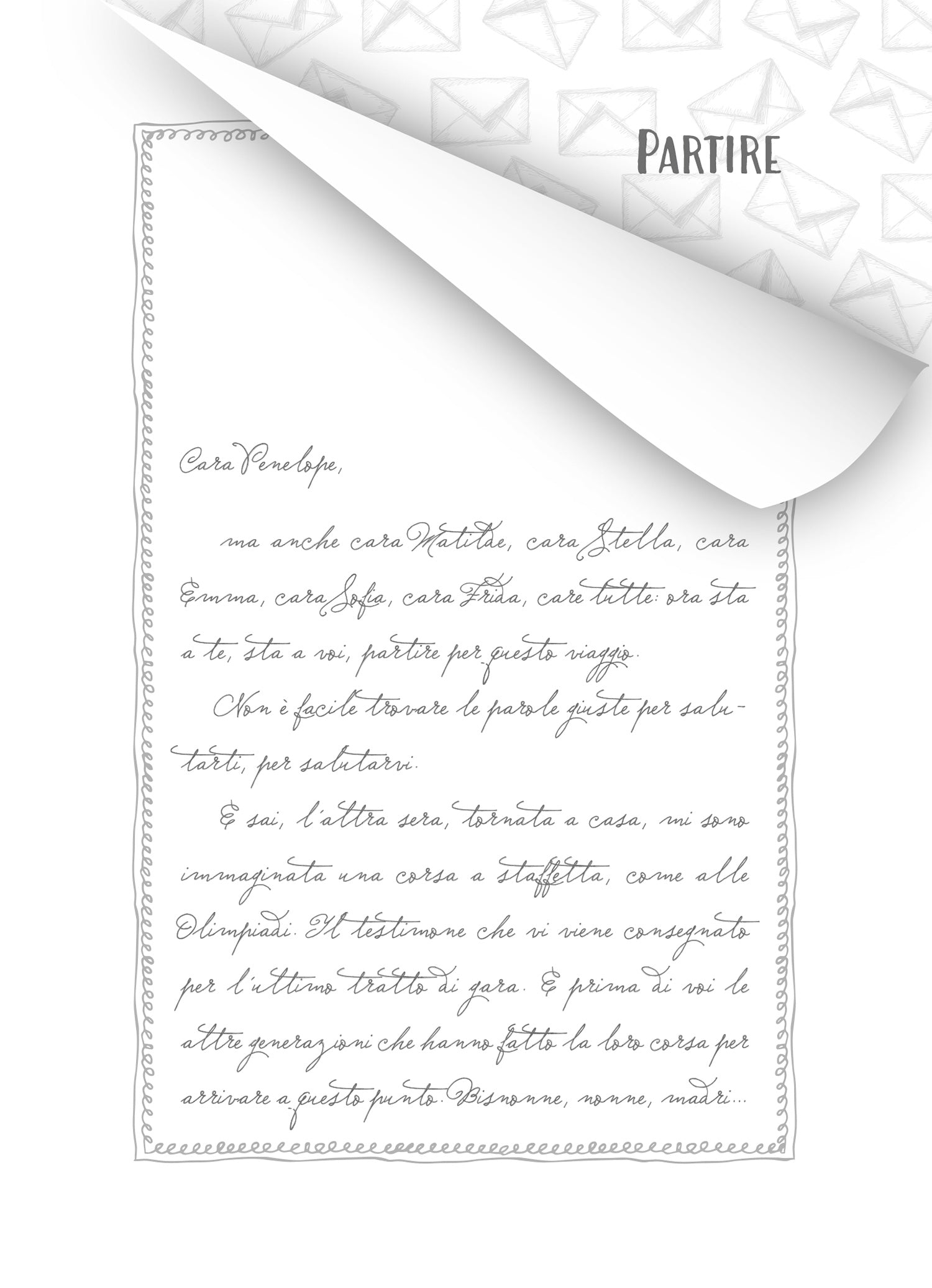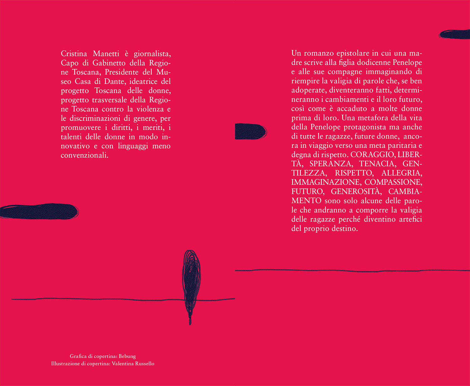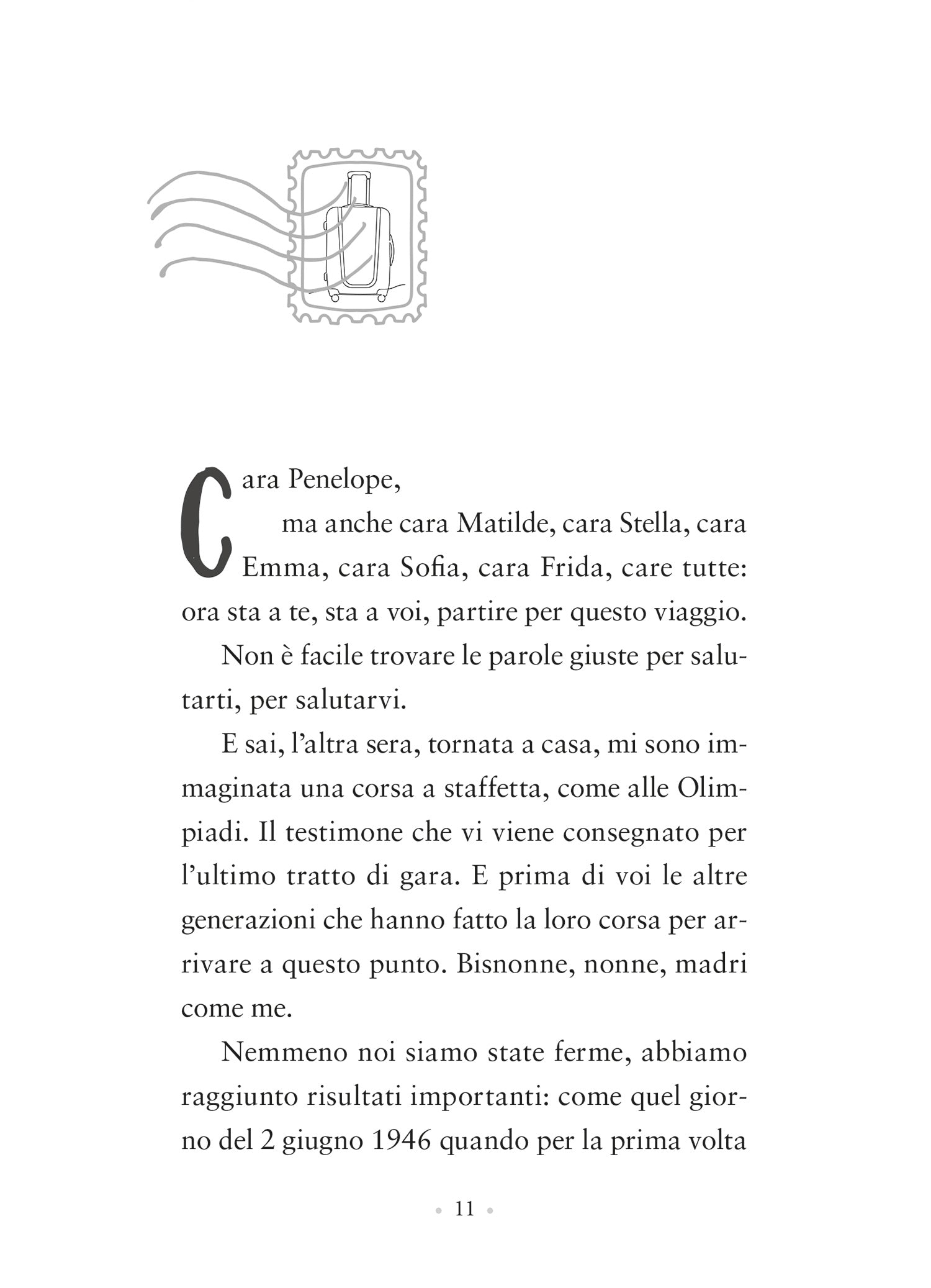 Un romanzo epistolare in cui una madre scrive alla figlia dodicenne Penelope e alle sue compagne immaginando di riempire la valigia di parole. Una metafora della vita della Penelope protagonista ma di tutte le ragazze, future donne, ancora in viaggio verso una meta paritaria e degna di rispetto. Coraggio, speranza, libertà, gentilezza, allegria, immaginazione, viaggio, tenacia, compassione, futuro, generosità, cambiamento sono solo alcune delle parole che andranno a comporre la valigia delle ragazze perché diventino artefici del proprio destino. Il ribaltamento del mito di Ulisse in un libro di grande attualità. Una presa di coscienza, sentitissima dalle nuove generazioni, per liberarsi dai vincoli e dai ruoli imposti dalla società patriarcale.