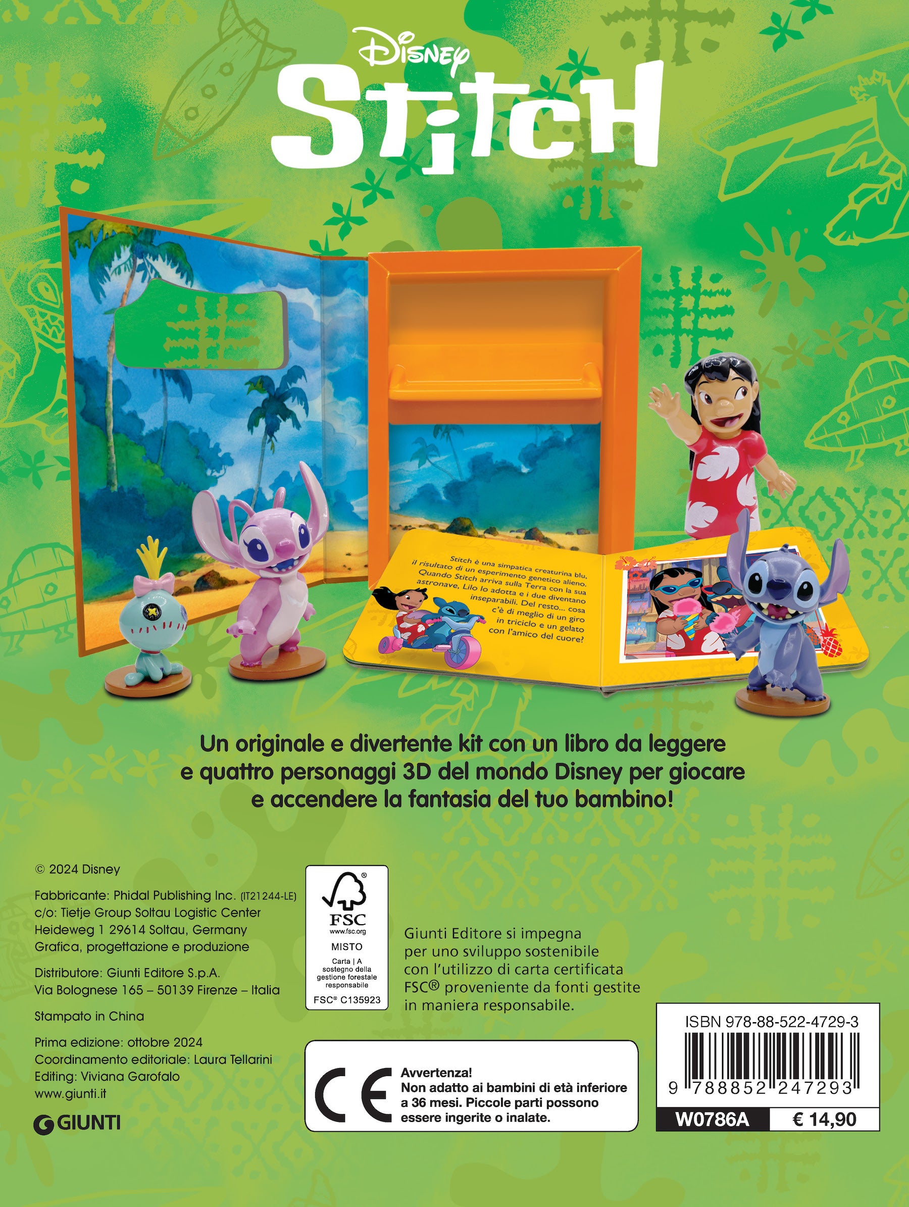 Il Baby Box è un libro stimolante che accompagna i lettori più piccoli alla scoperta del mondo di Stitch e delle sue avventure. La pratica scatola a forma di libro contiene un libro cartonato e 4 figurine 3d di plastica. Molto pratica, consente al bambino di riporre in ordine il libro e le figurine dopo l’uso. Il doppio utilizzo (lettura/gioco) favorisce il processo di identificazione e lo sviluppo delle attività manuali.