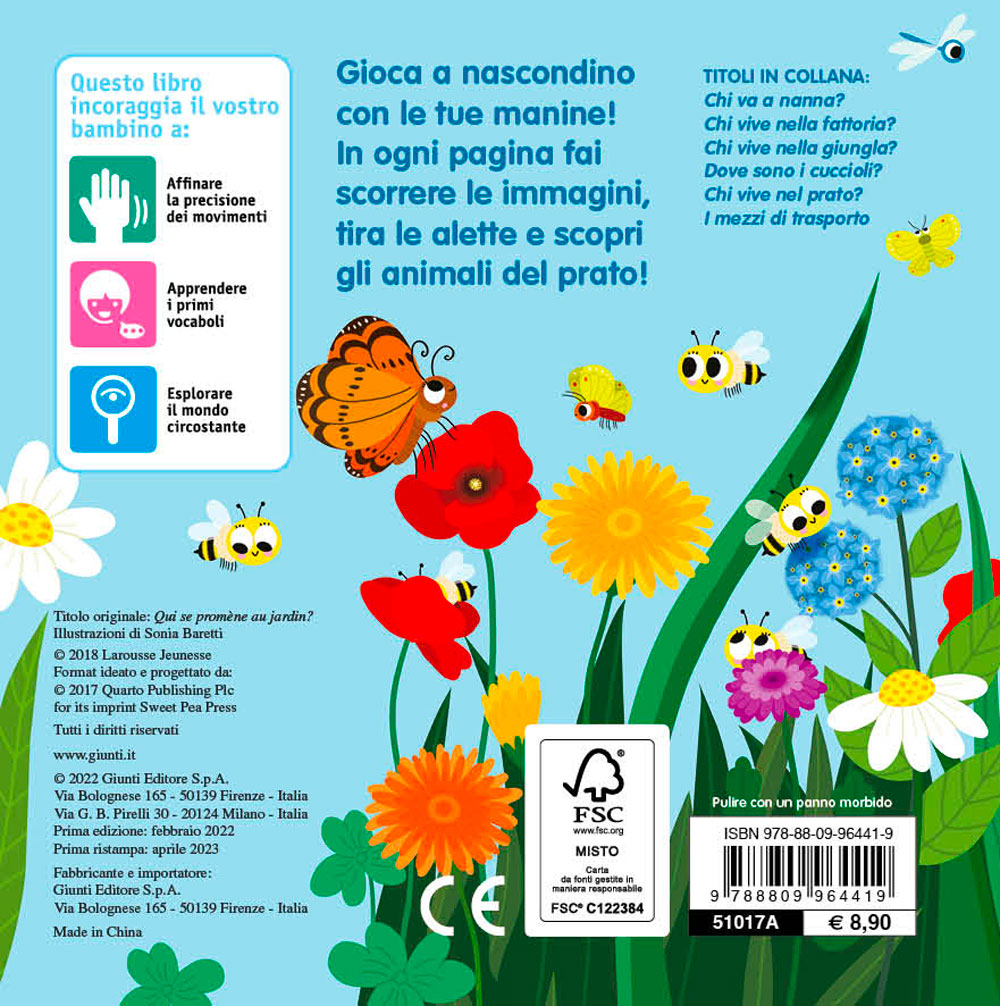 Chi si nasconde tra i fili d'erba del prato? Gioca a nascondino con le tue manine e scoprilo! In ogni pagina fai scorrere le immagini, tira le alette e scopri chi c'è sotto... Due nuovi titoli arricchiscono questa collana per i più piccoli, per accompagnarli nelle loro prime esplorazioni, aiutare la coordinazione dei movimenti e affinare la motricità fine attraverso un gioco divertente.