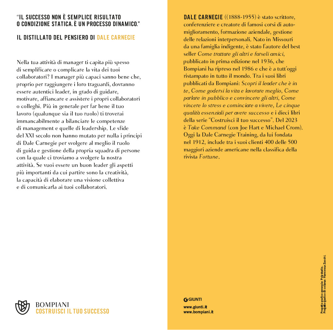 Nella tua attività di manager ti capita più spesso di semplificare o complicare la vita dei tuoi collaboratori? I manager più capaci sanno bene che, proprio per raggiungere i loro traguardi, dovranno essere autentici leader, in grado di guidare, motivare, affiancare e assistere i propri collaboratori o colleghi. Più in generale per far bene il tuo lavoro (qualunque sia il tuo ruolo) ti troverai immancabilmente a bilanciare le competenze di management e quelle di leadership. Le sfide del XXI secolo non hanno mutato per nulla i principi di Dale Carnegie per svolgere al meglio il ruolo di guida e gestione della propria squadra di persone con la quale ci troviamo a svolgere la nostra attività. Se vuoi essere un buon leader gli aspetti più importanti da cui partire sono la creatività, la capacità di elaborare una visione collettiva e di comunicarla ai tuoi collaboratori.