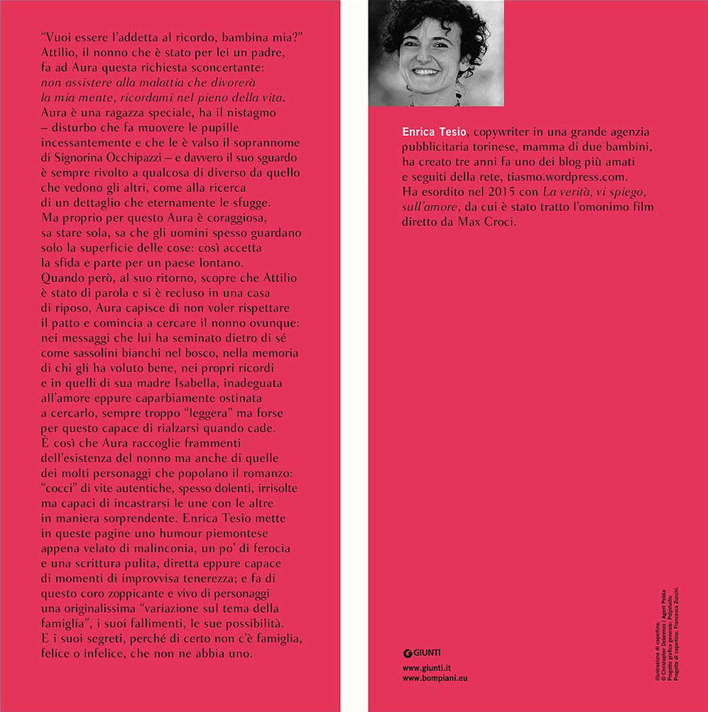 ''Vuoi essere l'addetta al ricordo, bambina mia?'' Attilio, il nonno che è stato per lei un padre, fa ad Aura questa richiesta sconcertante: non assistere alla malattia che divorerà la mia mente, ricordami nel pieno della vita. Aura è una ragazza speciale, ha il nistagmo - disturbo che fa muovere le pupille incessantemente e che le è valso il soprannome di Signorina Occhipazzi - e davvero il suo sguardo è sempre rivolto a qualcosa di diverso da quello che vedono gli altri, come alla ricerca di un dettaglio che eternamente le sfugge. Ma proprio per questo Aura è coraggiosa, sa stare sola, sa che gli uomini spesso guardano solo la superficie delle cose: così accetta la sfida e parte per un paese lontano. Quando però, al suo ritorno, scopre che Attilio è stato di parola e si è recluso in una casa di riposo, Aura capisce di non voler rispettare il patto e comincia a cercare il nonno ovunque: nei messaggi che lui ha seminato dietro di sé come sassolini bianchi nel bosco, nella memoria di chi gli ha voluto bene, nei propri ricordi e in quelli di sua madre Isabella, inadeguata all'amore eppure caparbiamente ostinata a cercarlo, sempre troppo ''leggera'' ma forse per questo capace di rialzarsi quando cade. E' così che Aura raccoglie frammenti dell'esistenza del nonno ma anche di quelle dei molti personaggi che popolano il romanzo: ''cocci'' di vite autentiche, spesso dolenti, irrisolte ma capaci di incastrarsi le une con le altre in maniera sorprendente. Enrica Tesio mette in queste pagine uno humour piemontese appena velato di malinconia, un po' di ferocia e una scrittura pulita, diretta eppure capace di momenti di improvvisa tenerezza; e fa di questo coro zoppicante e vivo di personaggi una originalissima ''variazione sul tema della famiglia'', i suoi fallimenti, le sue possibilità. E i suoi segreti, perché di certo non c'è famiglia, felice o infelice, che non ne abbia uno.