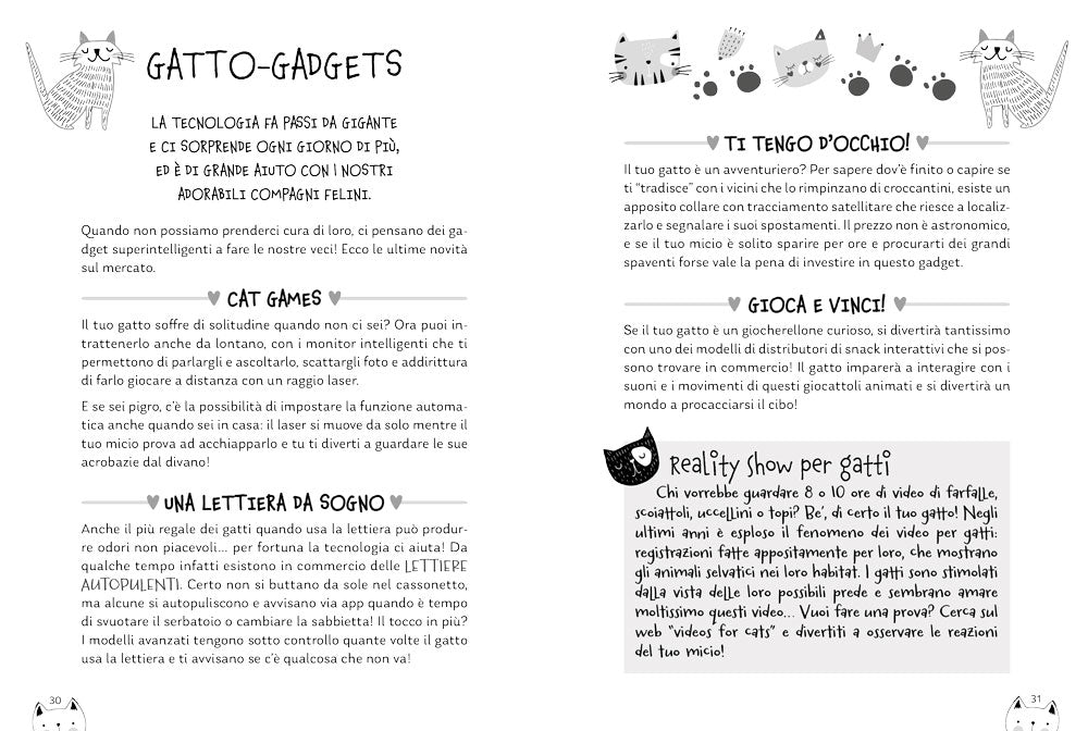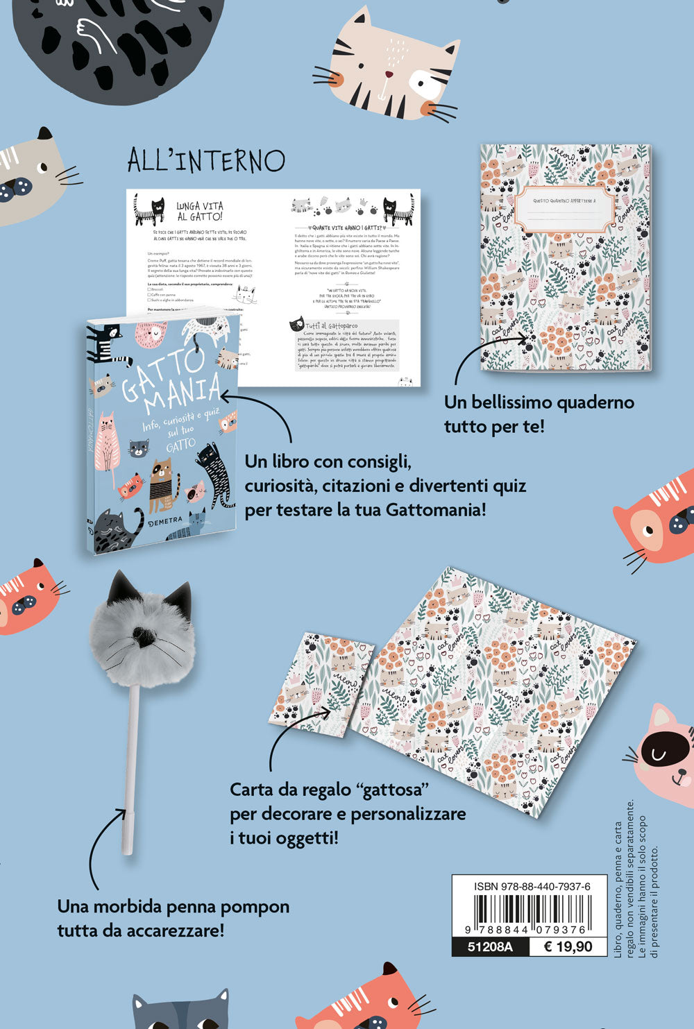 Una scatola ricca di piccoli tesori che ogni cat lover adorerà. All’interno: un libro ricco di curiosità, consigli per avere un gatto felice, aneddoti divertenti, citazioni e quiz sui gatti; una buffa penna-gatto, morbida e carezzevole; un bellissimo quaderno con grafica felina e carta da regalo a tema!