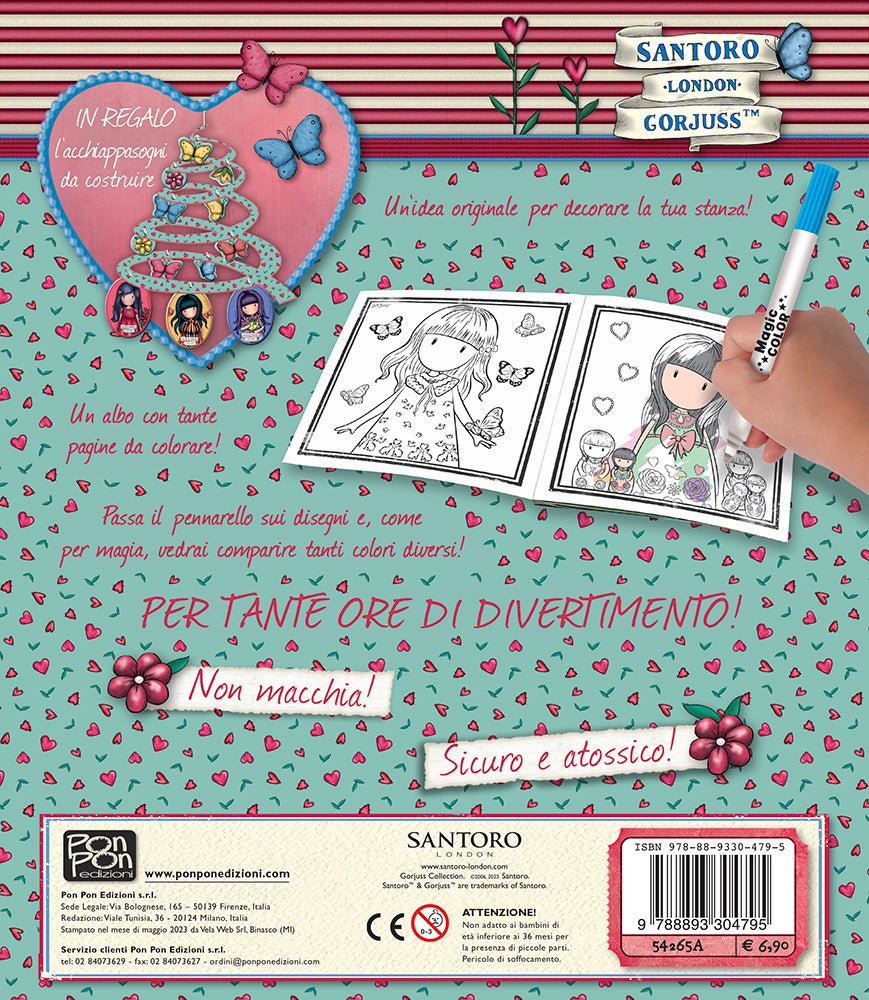 Colora il giardino fiorito delle graziose ragazze Gorjuss con il magico pennarello svelacolori. È atossico e non macchia! L'incanto continua anche nella tua stanza con l'elegante acchiappasogni da ritagliare incluso nella confezione. Dimensioni 25,5 x 34,8 cm.