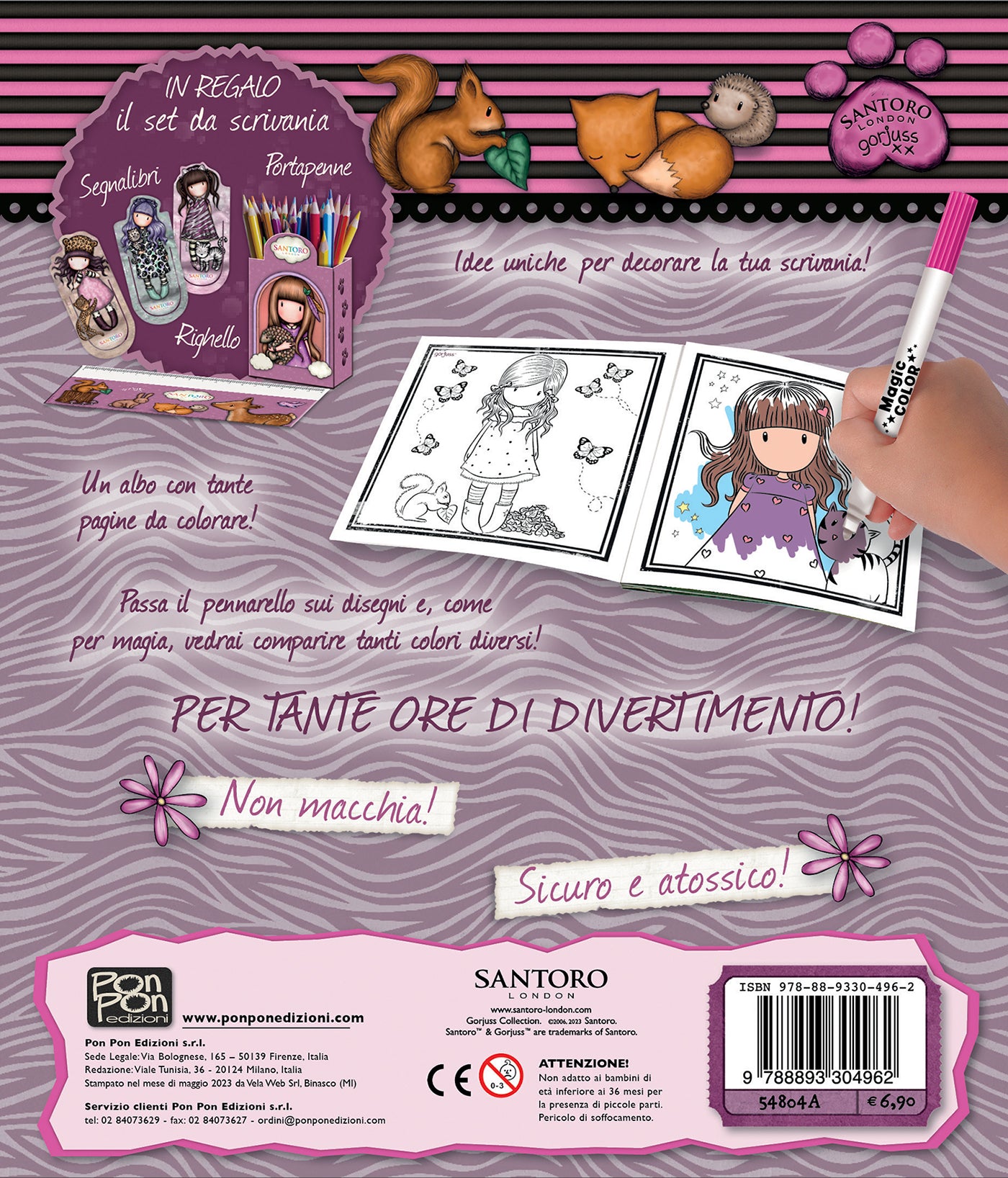 Colora i tenerissimi cuccioli delle ragazze Gorjuss con il magico pennarello svelacolori. È sicuro, atossico e non macchia. Il divertimento continua con il set da scrivania in regalo: sono inclusi nella confezione segnalibri, righello e portapenne da ritagliare. Dimensioni 25,5 x 34,8 cm.