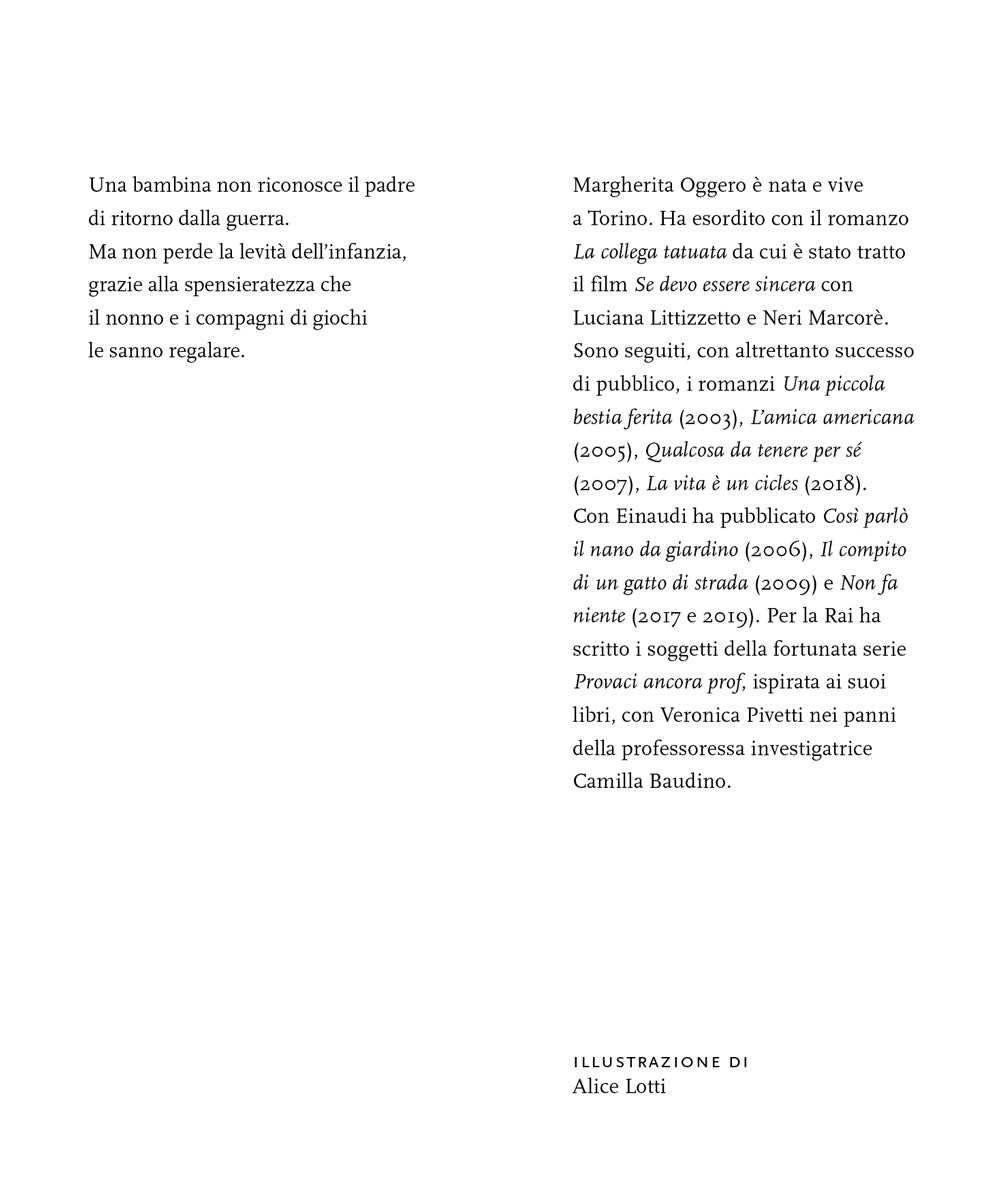 Una bambina conosce e non riconosce il padre di ritorno dalla Russia e vive le difficoltà del periodo bellico tra razionamenti di cibo, necessità di sfollare e bombardamenti. Ma non perde tuttavia la levità dell’infanzia, sapendo cogliere, in un momento tutt’altro che dorato, l’ironia, la gioia e la spensieratezza che il nonno, i compagni di giochi e di asilo sanno regalare. Un racconto emozionante e al tempo stesso ironico e pieno di disincanto che ripercorre aneddoti e situazioni ordinarie per chi ha vissuto la propria infanzia negli anni della Seconda guerra mondiale e nel primo dopoguerra.