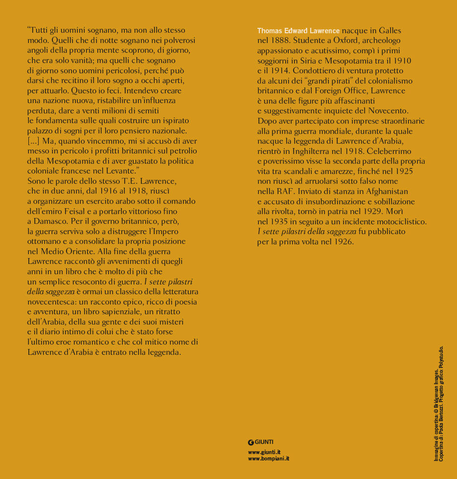 “Tutti gli uomini sognano, ma non allo stesso modo. Quelli che di notte sognano nei polverosi angoli della propria mente scoprono, di giorno, che era solo vanità; ma quelli che sognano di giorno sono uomini pericolosi, perché può darsi che recitino il loro sogno a occhi aperti, per attuarlo. Questo io feci. Intendevo creare una nazione nuova, ristabilire un’influenza perduta, dare a venti milioni di semiti le fondamenta sulle quali costruire un ispirato palazzo di sogni per il loro pensiero nazionale. [...] Ma, quando vincemmo, mi si accusò di aver messo in pericolo i profitti britannici sul petrolio della Mesopotamia e di aver guastato la politica coloniale francese nel Levante.” Sono le parole dello stesso T.E. Lawrence, che in due anni, dal 1916 al 1918, riuscì a organizzare un esercito arabo sotto il comando dell’emiro Feisal e a portarlo vittorioso fino a Damasco. Per il governo britannico, però, la guerra serviva solo a distruggere l’Impero ottomano e a consolidare la propria posizione nel Medio Oriente. Alla fine della guerra Lawrence raccontò gli avvenimenti di quegli anni in un libro che è molto di più che un semplice resoconto di guerra. I sette pilastri della saggezza è ormai un classico della letteratura novecentesca: un racconto epico, ricco di poesia e avventura, un libro sapienziale, un ritratto dell’Arabia, della sua gente e dei suoi misteri e il diario intimo di colui che è stato forse l’ultimo eroe romantico e che col mitico nome di Lawrence d’Arabia è entrato nella leggenda. Immagine