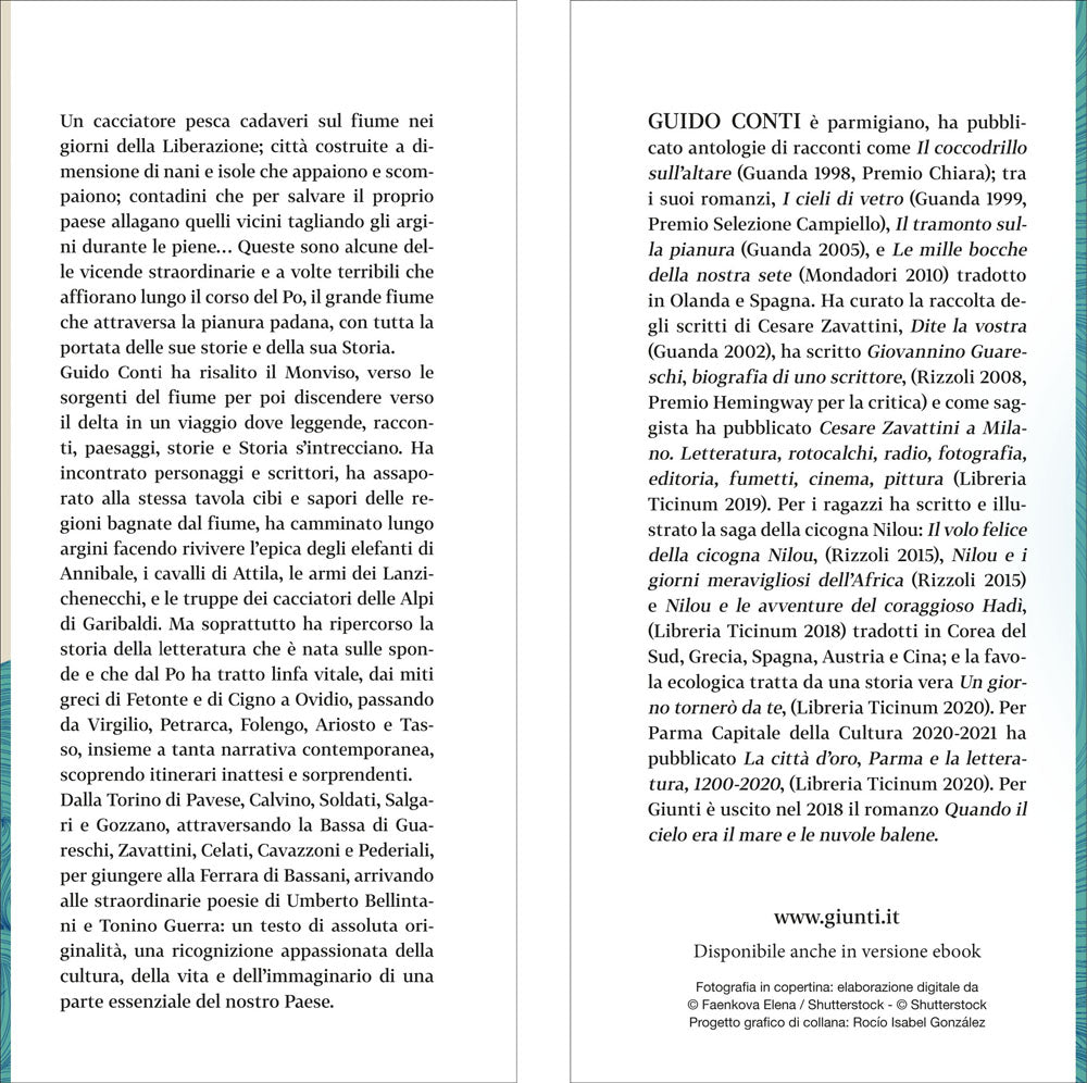 Guido Conti ha risalito il Monviso, verso le sorgenti del fiume per poi discendere verso il delta in un viaggio dove leggende, racconti, paesaggi, storie e Storia s’intrecciano. Ha incontrato personaggi e scrittori, ha assaporato alla stessa tavola cibi e sapori delle regioni bagnate dal fiume, ha camminato lungo argini facendo rivivere l’epica degli elefanti di Annibale, i cavalli di Attila, le armi dei Lanzichenecchi, e le truppe dei cacciatori delle Alpi di Garibaldi. Ma soprattutto ha ripercorso la storia della letteratura che è nata sulle sponde e che dal Po ha tratto linfa vitale, dai miti greci di Fetonte e di Cigno a Ovidio, passando da Virgilio, Petrarca, Folengo, Ariosto e Tasso, insieme a tanta narrativa contemporanea, scoprendo itinerari inattesi e sorprendenti.