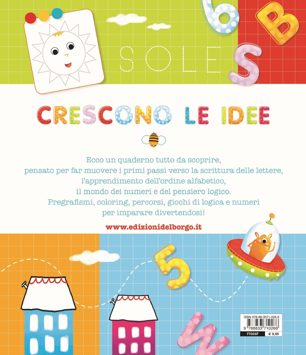 Ecco un quaderno tutto da scoprire, pensato per far muovere i primi passi verso la scrittura delle lettere, l'apprendimento dell'ordine alfabetico, il mondo dei numeri e del pensiero logico. Pregrafismi, coloring, percorsi, giochi di logica e numeri per imparare divertendosi!