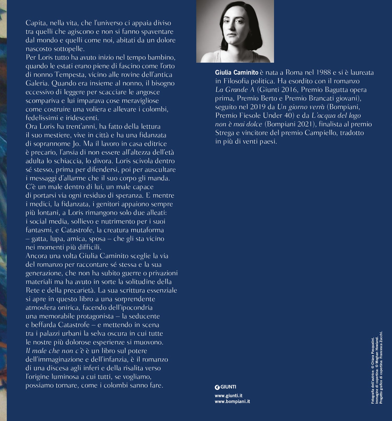 Ancora una volta Giulia Caminito sceglie la via del romanzo per raccontare sé stessa e la sua generazione, che non ha subito guerre o privazioni materiali ma ha avuto in sorte la solitudine della Rete e della precarietà. La sua scrittura essenziale si apre in questo libro a una sorprendente atmosfera onirica, facendo dell’ipocondria una memorabile protagonista – la seducente e beffarda Catastrofe – e mettendo in scena tra i palazzi urbani la selva oscura in cui tutte le nostre più dolorose esperienze si muovono. Il male che non c’è è un libro sul potere dell’immaginazione e dell’infanzia, è il romanzo di una discesa agli inferi e della risalita verso l’origine luminosa a cui tutti, se vogliamo, possiamo tornare, come solo i colombi sanno fare.