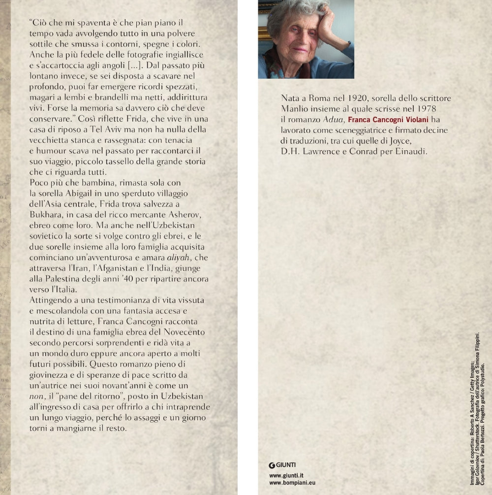 ''Ciò che mi spaventa è che pian piano il tempo vada avvolgendo tutto in una polvere sottile che smussa i contorni, spegne i colori. Anche la più fedele delle fotografie ingiallisce e s'accartoccia agli angoli (...). Dal passato più lontano invece, se sei disposta a scavare nel profondo, puoi far emergere ricordi spezzati, magari a lembi e brandelli ma netti, addirittura vivi. Forse la memoria sa davvero ciò che deve conservare.'' Così riflette Frida, che vive in una casa di riposo a Tel Aviv ma non ha nulla della vecchietta stanca e rassegnata: con tenacia e humour scava nel passato per raccontarci il suo viaggio, piccolo tassello della grande storia che ci riguarda tutti. Poco più che bambina, rimasta sola con la sorella Abigail in uno sperduto villaggio dell'Asia centrale, Frida trova salvezza a Bukhara, in casa del ricco mercante Asherov, ebreo come loro. Ma anche nell'Uzbekistan sovietico la sorte si volge contro gli ebrei, e le due sorelle insieme alla loro famiglia acquisita cominciano un'avventurosa e amara aliyah, che attraversa l'Iran, l'Afganistan e l'India, giunge alla Palestina degli anni '40 per ripartire ancora verso l'Italia. Attingendo a una testimonianza di vita vissuta e mescolandola con una fantasia accesa e nutrita di letture, Franca Cancogni racconta il destino di una famiglia ebrea del Novecento secondo percorsi sorprendenti e ridà vita a un mondo duro eppure ancora aperto a molti futuri possibili. Questo romanzo pieno di giovinezza e di speranze di pace scritto da un'autrice nei suoi novant'anni è come un ''non'', il ''pane del ritorno'', posto in Uzbekistan all'ingresso di casa per offrirlo a chi intraprende un lungo viaggio, perché lo assaggi e un giorno torni a mangiarne il resto.