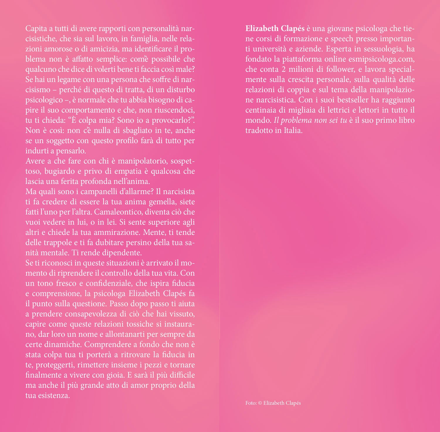 Se ti riconosci in queste situazioni è arrivato il momento di riprendere il controllo della tua vita. Con un tono fresco e confidenziale, che ispira fiducia e comprensione, la psicologa Elizabeth Clapés fa il punto sulla questione. Passo dopo passo ti aiuta a prendere consapevolezza di ciò che hai vissuto, capire come queste relazioni tossiche si instaurano, dar loro un nome e allontanarti per sempre da certe dinamiche. Comprendere a fondo che non è stata colpa tua ti porterà a ritrovare la fiducia in te, proteggerti, rimettere insieme i pezzi e tornare finalmente a vivere con gioia. E sarà il più difficile ma anche il più grande atto di amor proprio della tua esistenza.