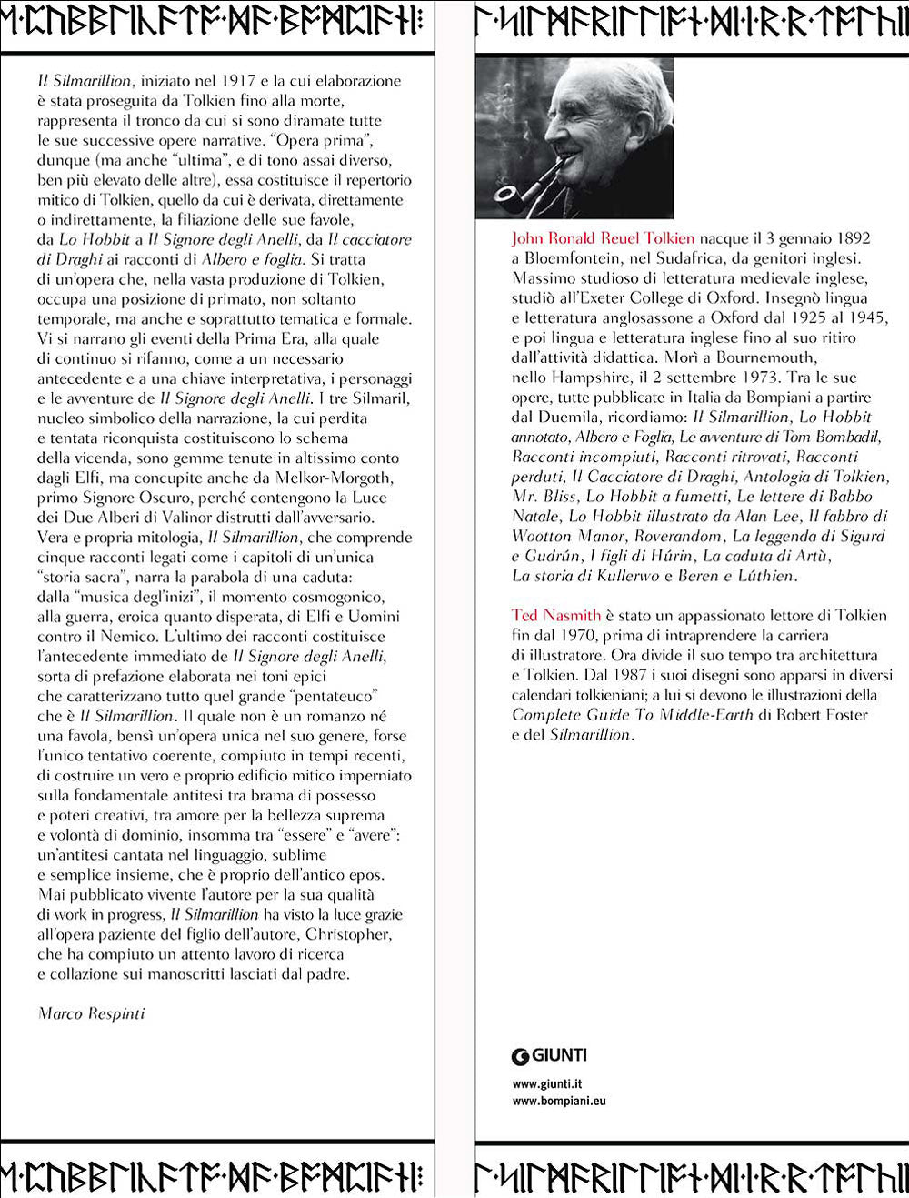 ''Il Silmarillion'', iniziato nel 1917 e la cui elaborazione è stata proseguita da Tolkien fino alla morte, rappresenta il tronco da cui si sono diramate tutte le sue successive opere narrative. ''Opera prima'', dunque (ma anche ''ultima'', e di tono assai diverso, ben più elevato delle altre), essa costituisce il repertorio mitico di Tolkien, quello da cui è derivata, direttamente o indirettamente, la filiazione delle sue favole, da ''Lo Hobbit'' a ''Il Signore degli Anelli'', da ''Il cacciatore di Draghi'' ai racconti di ''Albero e foglia''. Si tratta di un'opera che, nella vasta produzione di Tolkien, occupa una posizione di primato, non soltanto temporale, ma anche e soprattutto tematica e formale. Vi si narrano gli eventi della Prima Era, alla quale di continuo si rifanno, come a un necessario antecedente e a una chiave interpretativa, i personaggi e le avventure de ''Il Signore degli Anelli''. I tre Silmaril, nucleo simbolico della narrazione, la cui perdita e tentata riconquista costituiscono lo schema della vicenda, sono gemme tenute in altissimo conto dagli Elfi, ma concupite anche da Melkor-Morgoth, primo Signore Oscuro, perché contengono la Luce dei Due Alberi di Valinor distrutti dall'avversario. Vera e propria mitologia, ''Il Silmarillion'', che comprende cinque racconti legati come i capitoli di un'unica ''storia sacra'', narra la parabola di una caduta: dalla ''musica degl'inizi'', il momento cosmogonico, alla guerra, eroica quanto disperata, di Elfi e Uomini contro il Nemico. L'ultimo dei racconti costituisce l'antecedente immediato de ''Il Signore degli Anelli'', sorta di prefazione elaborata nei toni epici che caratterizzano tutto quel grande ''pentateuco'' che è ''Il Silmarillion''. Il quale non è un romanzo né una favola, bensì un'opera unica nel suo genere, forse l'unico tentativo coerente, compiuto in tempi recenti, di costruire un vero e proprio edificio mitico imperniato sulla fondamentale antitesi tra brama di possesso e poteri creativi, tra amore per la bellezza suprema e volontà di dominio, insomma tra ''essere'' e ''avere'': un'antitesi cantata nel linguaggio, sublime e semplice insieme, che è proprio dell'antico epos. Mai pubblicato vivente l'autore per la sua qualità di work in progress, ''Il Silmarillion'' ha visto la luce grazie all'opera paziente del figlio dell'autore, Christopher, che ha compiuto un attento lavoro di ricerca e collazione sui manoscritti lasciati dal padre. (Marco Respinti) Titolo originale: ''The Silmarillion'' (1997).