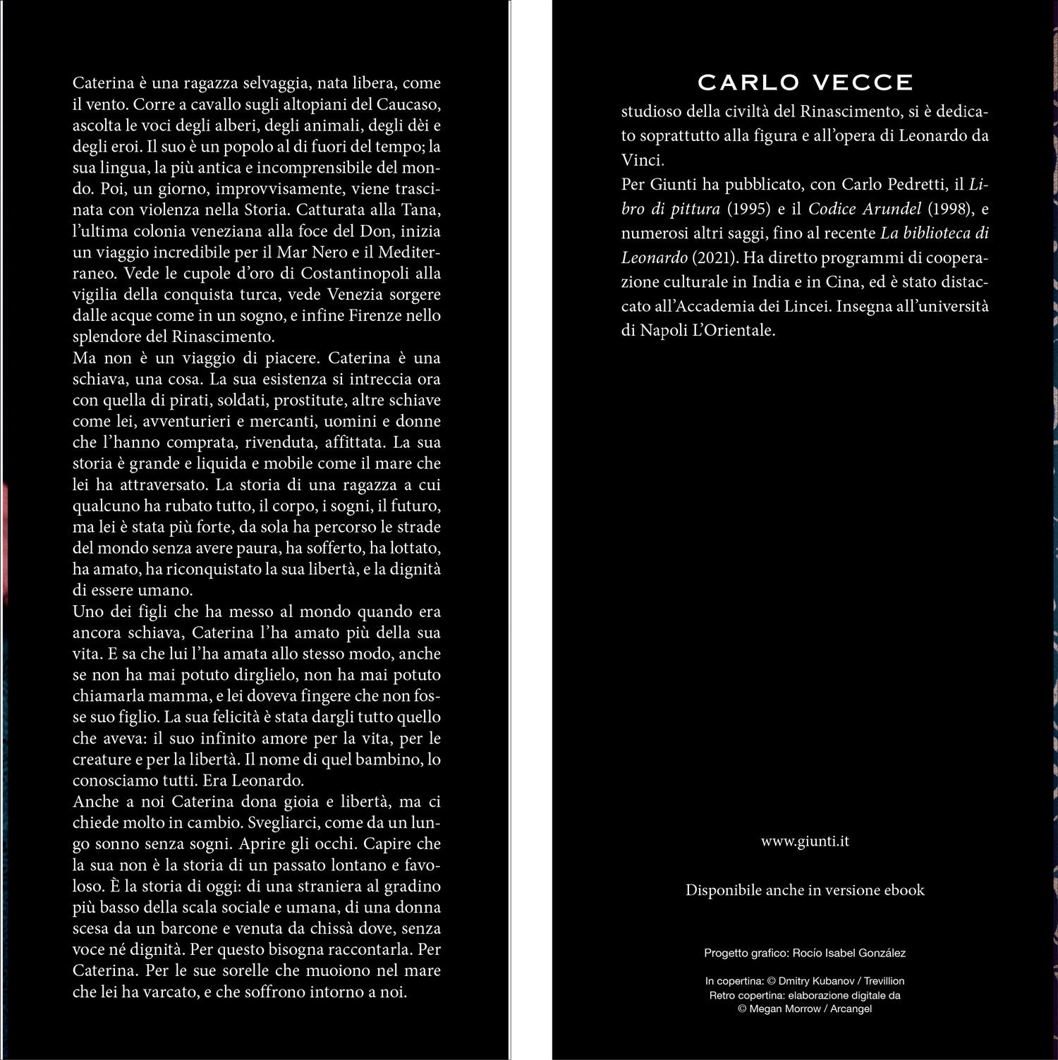 Caterina è una ragazza selvaggia, nata libera, come il vento. Corre a cavallo sugli altopiani del Caucaso, ascolta le voci degli alberi, degli animali, degli dèi e degli eroi. Il suo è un popolo al di fuori del tempo; la sua lingua, la più antica e incomprensibile del mondo. Poi, un giorno, improvvisamente, viene trascinata con violenza nella Storia. Catturata alla Tana, l’ultima colonia veneziana alla foce del Don, inizia un viaggio incredibile per il Mar Nero e il Mediterraneo. Vede le cupole d’oro di Costantinopoli alla vigilia della conquista turca, vede Venezia sorgere dalle acque come in un sogno, e infine Firenze nello splendore del Rinascimento. Ma non è un viaggio di piacere. Caterina è una schiava, una cosa. La sua esistenza si intreccia ora con quella di pirati, soldati, prostitute, altre schiave come lei, avventurieri e mercanti, uomini e donne che l’hanno comprata, rivenduta, affittata. La sua storia è grande e liquida e mobile come il mare che lei ha attraversato. La storia di una ragazza a cui qualcuno ha rubato tutto, il corpo, i sogni, il futuro, ma lei è stata più forte, da sola ha percorso le strade del mondo senza avere paura, ha sofferto, ha lottato, ha amato, ha riconquistato la sua libertà, e la dignità di essere umano. Uno dei figli che ha messo al mondo quando era ancora schiava, Caterina l’ha amato più della sua vita. E sa che lui l’ha amata allo stesso modo, anche se non ha mai potuto dirglielo, non ha mai potuto chiamarla mamma, e lei doveva fingere che non fosse suo figlio. La sua felicità è stata dargli tutto quello che aveva: il suo infinito amore per la vita, per le creature e per la libertà. Il nome di quel bambino, lo conosciamo tutti. Era Leonardo. Anche a noi Caterina dona gioia e libertà, ma ci chiede molto in cambio. Svegliarci, come da un lungo sonno senza sogni. Aprire gli occhi. Capire che la sua non è la storia di un passato lontano e favoloso. È la storia di oggi: di una straniera al gradino più basso della scala sociale e umana, di una donna scesa da un barcone e venuta da chissà dove, senza voce né dignità. Per questo bisogna raccontarla. Per Caterina. Per le sue sorelle che muoiono nel mare che lei ha varcato, e che soffrono intorno a noi.