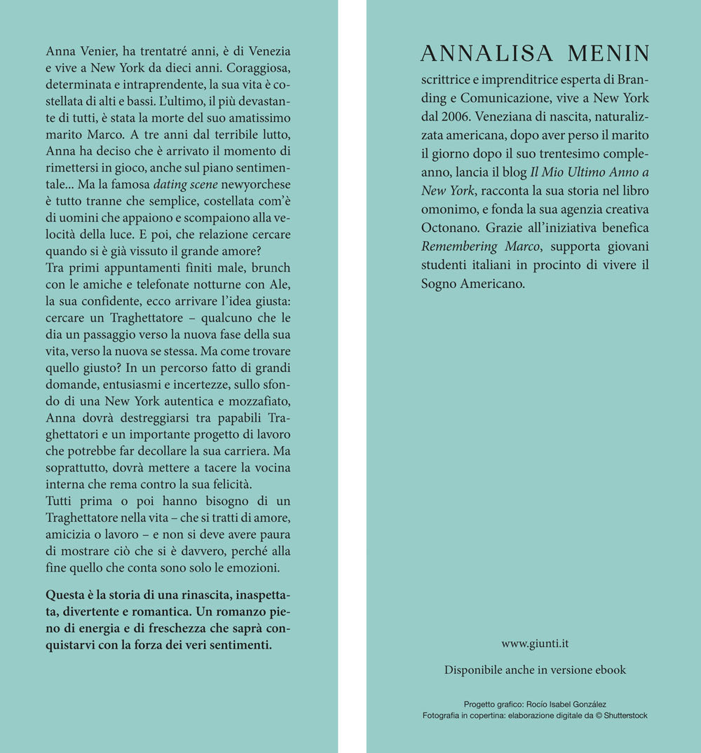 Anna Venier, ha 33 anni, è di Venezia e vive a New York da 10 anni. Coraggiosa, determinata e intraprendente, la sua vita è costellata di alti e bassi. L’ultimo, il più devastante di tutti, è stata la morte del suo amatissimo marito Marco. A tre anni dal terribile lutto, Anna ha deciso che è arrivato il momento di rimettersi in gioco, anche sul piano sentimentale... Ma la famosa dating scene newyorchese è tutto tranne che semplice, costellata com’è di uomini che appaiono e scompaiono alla velocità della luce. E poi, che relazione cercare quando si è già vissuto il grande amore? Tra primi appuntamenti finiti male, brunch con le amiche e telefonate notturne con Ale, la sua confidente, ecco arrivare l’idea giusta: cercare un Traghettatore – qualcuno che le dia un passaggio verso la nuova fase della sua vita, verso la nuova se stessa. Ma come trovare quello giusto? In un percorso fatto di grandi domande, entusiasmi e incertezze, sullo sfondo di una New York autentica e mozzafiato, Anna dovrà destreggiarsi tra papabili Traghettatori e un importante progetto di lavoro che potrebbe far decollare la sua carriera. Ma soprattutto, dovrà mettere a tacere la vocina interna che rema contro la sua felicità. Tutti prima o poi hanno bisogno di un Traghettatore nella vita – che si tratti di amore, amicizia o lavoro – e non si deve avere paura di mostrare ciò che si è davvero, perché alla fine quello che conta sono solo le emozioni. Questa è la storia di una rinascita, inaspettata, divertente e romantica. Un romanzo pieno di energia e di freschezza che saprà conquistarvi con la forza dei veri sentimenti.
