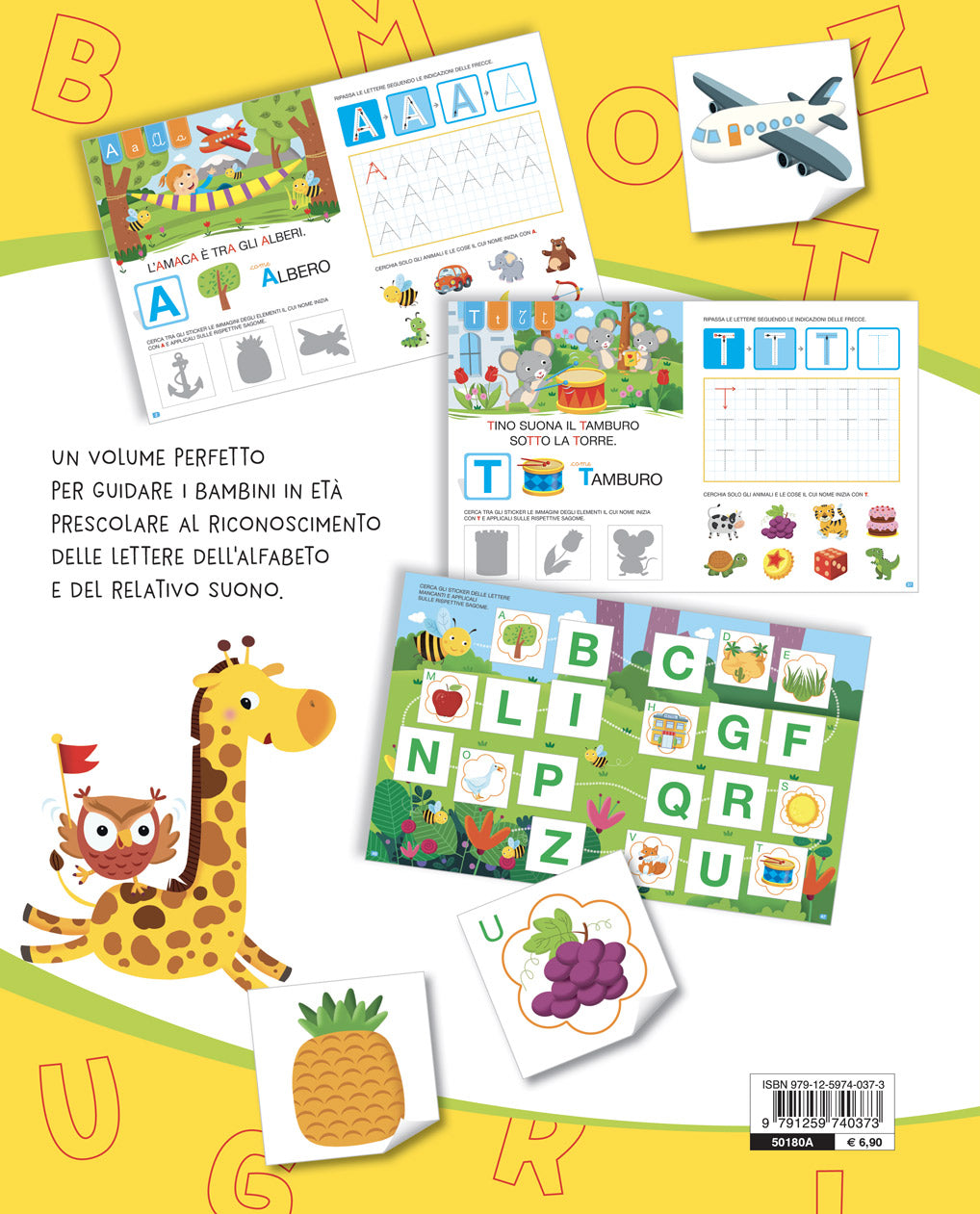 Un volume semplice, completo ed efficace per guidare i bambini al riconoscimento delle lettere dell’alfabeto e del relativo suono. Il volume comprende anche 4 pagine con 80 sticker funzionali ad attivitià di riconoscimento forme e di associazione fonema-grafema.
