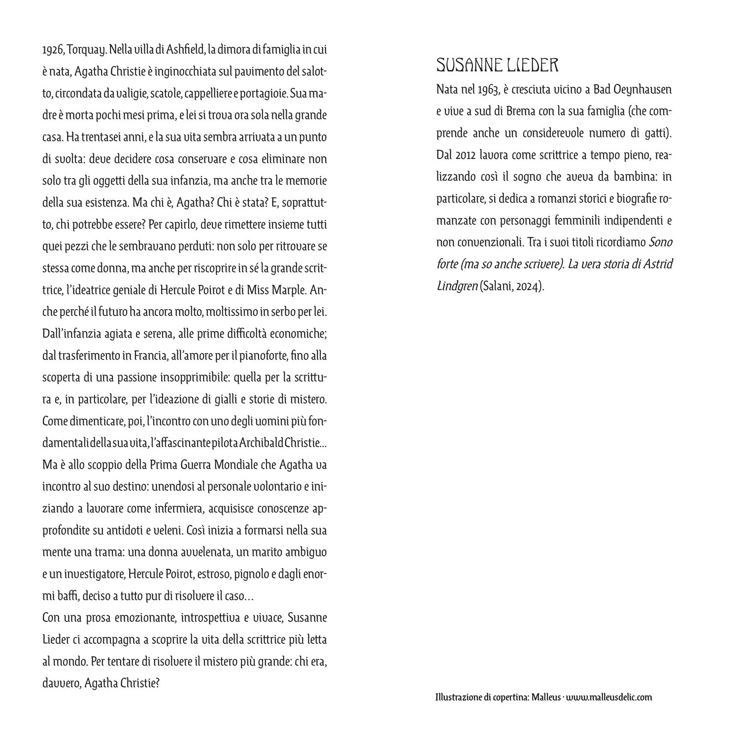Con una prosa emozionante, introspettiva e vivace, Susanne Lieder ci accompagna a scoprire la vita della scrittrice più letta al mondo. Per tentare di risolvere il mistero più grande: chi era, davvero, Agatha Christie?