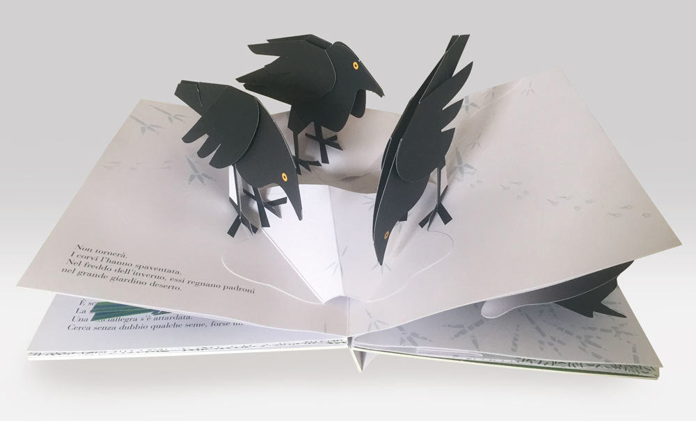 L'inverno è arrivato. Pagina dopo pagina, la neve ricopre una piccola nocciola dimenticata da uno scoiattolo troppo frettoloso, mentre altri animali si avventurano nel giardino: un topolino, una cinciallegra, tre corvi e un gatto. Poi la primavera ritorna...