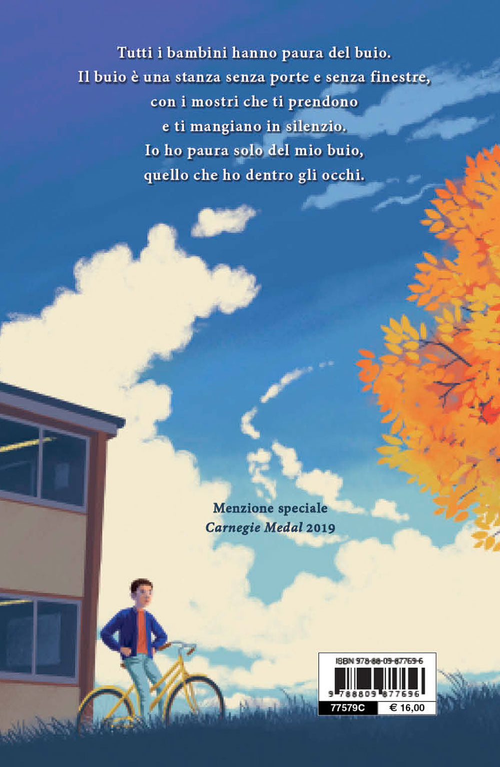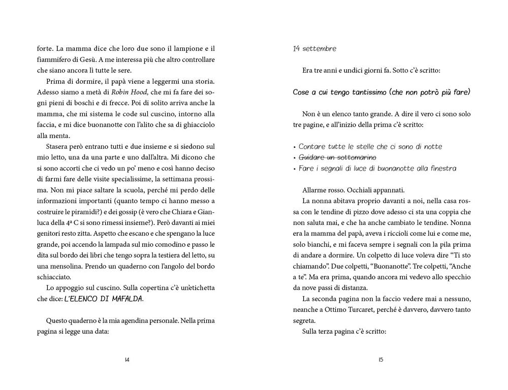 Un romanzo delicato e intenso, che descrive un cambiamento irreversibile e la strada, fatta di amore e coraggio, per affrontarlo: Mafalda ha nove anni, indossa un paio di spessi occhiali gialli e conosce a memoria "Il barone rampante" di Italo Calvino. Scappa dai professori arrampicandosi sul ciliegio all’entrata della scuola insieme a Ottimo Turcaret, il fedele gatto che la segue ovunque. Su quel ciliegio sogna perfino di andarci a vivere, ma tra pochi mesi non lo potrà più vedere perché i suoi occhi si stanno spegnendo e un po’ alla volta, giorno dopo giorno: diventerà cieca. È una bambina curiosa e l’idea di rimanere al buio la spaventa: per questo tiene un diario in cui annota le cose che non potrà più fare, come contare le stelle e giocare a calcio con Filippo, il bullo della classe che parla solo con lei. Grazie all’aiuto della sua famiglia e dei suoi amici, Mafalda capisce che un altro modo di vedere è possibile. Impara a misurare la distanza dal ciliegio accompagnata dal profumo dei fiori e comincia a scrivere un nuovo elenco: quello delle cose a cui tiene e che riesce a fare, nonostante il buio. Un romanzo poetico, struggente e profondo che si legge tutto d’un fiato, con un groppo in gola ma, insieme, con un sorriso pieno di speranza.