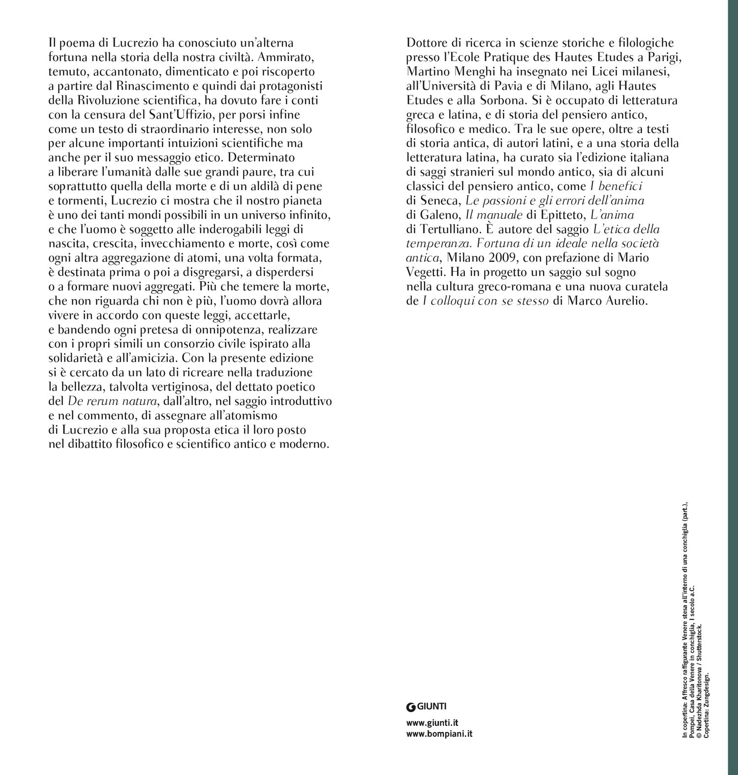Il poema di Lucrezio ha conosciuto un’alterna fortuna nella storia della nostra civiltà. Ammirato, temuto, accantonato, dimenticato e poi riscoperto a partire dal Rinascimento e quindi dai protagonisti della Rivoluzione scientifica, ha dovuto fare i conti con la censura del Sant’Uffizio, per porsi infine come un testo di straordinario interesse, non solo per alcune importanti intuizioni scientifiche ma anche per il suo messaggio etico. Determinato a liberare l’umanità dalle sue grandi paure, tra cui soprattutto quella della morte e di un aldilà di pene e tormenti, Lucrezio ci mostra che il nostro pianeta è uno dei tanti mondi possibili in un universo infinito, e che l’uomo è soggetto alle inderogabili leggi di nascita, crescita, invecchiamento e morte, così come ogni altra aggregazione di atomi, una volta formata, è destinata prima o poi a disgregarsi, a disperdersi o a formare nuovi aggregati. Più che temere la morte, che non riguarda chi non è più, l’uomo dovrà allora vivere in accordo con queste leggi, accettarle, e bandendo ogni pretesa di onnipotenza, realizzare con i propri simili un consorzio civile ispirato alla solidarietà e all’amicizia. Con la presente edizione si è cercato da un lato di ricreare nella traduzione la bellezza, talvolta vertiginosa, del dettato poetico del De rerum natura, dall’altro, nel saggio introduttivo e nel commento, di assegnare all’atomismo di Lucrezio e alla sua proposta etica il loro posto nel dibattito filosofico e scientifico antico e moderno.