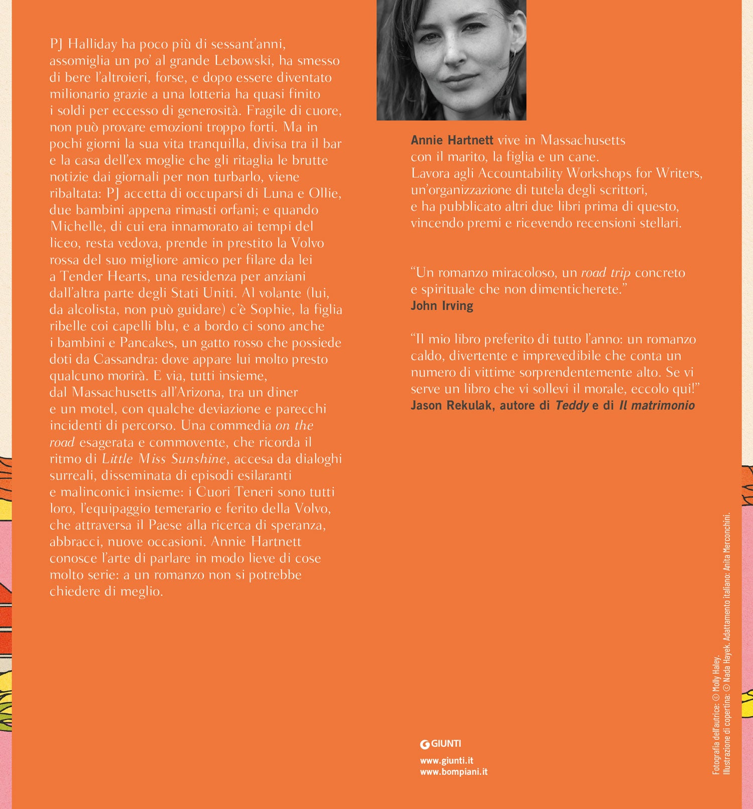 Michelle, di cui era innamorato ai tempi del liceo, resta vedova, prende in prestito la Volvo rossa del suo migliore amico per filare da lei a Tender Hearts, una residenza per anziani dall'altra parte degli Stati Uniti. Al volante (lui, da alcolista, non può guidare) c'è Sophie, la figlia ribelle coi capelli blu, e a bordo ci sono anche i bambini e Pancakes, un gatto rosso che possiede doti da Cassandra: dove appare lui molto presto qualcuno morirà. E via, tutti insieme, dal Massachusetts all'Arizona, tra un diner e un motel, con qualche deviazione e parecchi incidenti di percorso. Una commedia on the road esagerata e commovente, che ricorda il ritmo di Little Miss Sunshine, accesa da dialoghi surreali, disseminata di episodi esilaranti e malinconici insieme: i Cuori Teneri sono tutti loro, l'equipaggio temerario e ferito della Volvo, che attraversa il Paese alla ricerca di speranza, abbracci, nuove occasioni. Annie Hartnett