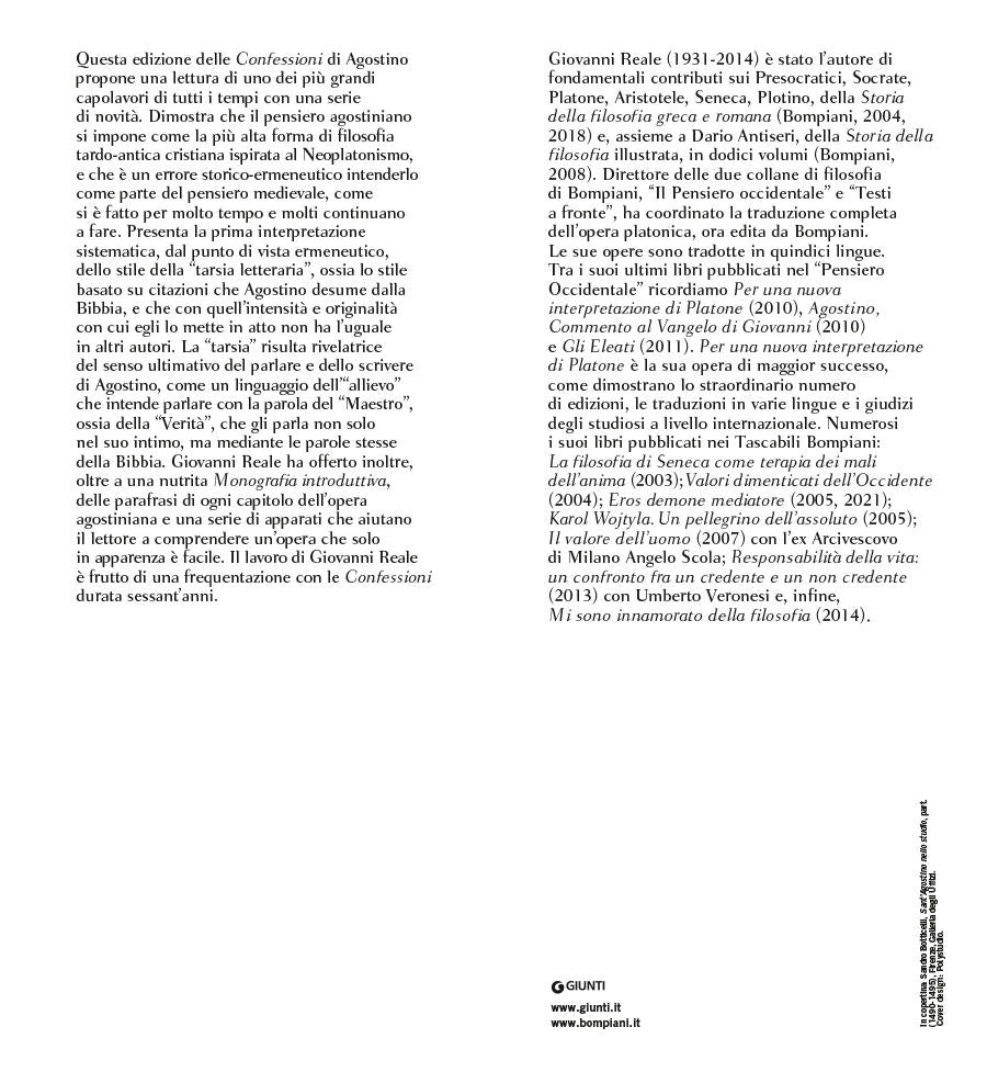 Questa edizione delle Confessioni di Agostino propone una lettura di uno dei più grandi capolavori di tutti i tempi con una serie di novità. Dimostra che il pensiero agostiniano si impone come la più alta forma di filosofia tardo-antica cristiana ispirata al Neoplatonismo, e che è un errore storico-ermeneutico intenderlo come parte del pensiero medievale, come si è fatto per molto tempo e molti continuano a fare. Presenta la prima interpretazione sistematica, dal punto di vista ermeneutico, dello stile della "tarsia letteraria", ossia lo stile basato su citazioni che Agostino desume dalla Bibbia, e che con quell'intensità e originalità con cui egli la mette in atto non ha l'uguale in altri autori. La "tarsia" risulta rivelatrice del senso ultimativo del parlare e dello scrivere di Agostino, come un linguaggio dell'"allievo" che intende parlare con la parola del "Maestro", ossia della "Verità", che gli parla non solo nel suo Intimo, ma mediante le parole stesse della Bibbia. Giovanni Reale offre anche, oltre a una nutrita Monografia introduttiva, delle parafrasi di ogni capitolo dell'opera agostiniana e una serie di apparati, che aiutano il lettore a comprendere un'opera che solo in apparenza è facile. Il lavoro di Reale è frutto di una frequentazione con le Confessioni di ben sessanta anni.