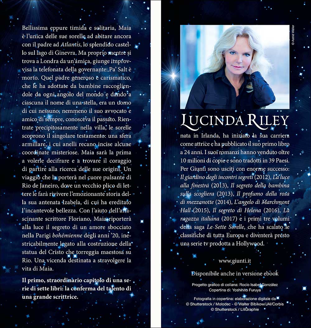 Bellissima eppure timida e solitaria, Maia è l'unica delle sue sorelle ad abitare ancora con il padre ad Atlantis, lo splendido castello sul lago di Ginevra. Ma proprio mentre si trova a Londra da un'amica, giunge improvvisa la telefonata della governante. Pa' Salt è morto. Quel padre generoso e carismatico, che le ha adottate da bambine raccogliendole da ogni angolo del mondo e dando a ciascuna il nome di una stella, era un uomo di cui nessuno, nemmeno il suo avvocato e amico di sempre, conosceva il passato. Rientrate precipitosamente nella villa, le sorelle scoprono il singolare testamento: una sfera armillare, i cui anelli recano incise alcune coordinate misteriose. Maia sarà la prima a volerle decifrare e a trovare il coraggio di partire alla ricerca delle sue origini. Un viaggio che la porterà nel cuore pulsante di Rio de Janeiro, dove un vecchio plico di lettere le farà rivivere l'emozionante storia della sua antenata Izabela, di cui ha ereditato l'incantevole bellezza. Con l'aiuto dell'affascinante scrittore Floriano, Maia riporterà alla luce il segreto di un amore sbocciato nella Parigi bohémienne degli anni '20, inestricabilmente legato alla costruzione della statua del Cristo che torreggia maestosa su Rio. Una vicenda destinata a stravolgere la vita di Maia. Il primo, straordinario capitolo di una serie di sette libri: la conferma del talento di una grande scrittrice. Titolo originale: ''The Seven Sisters. Maia's Story'' (2014).
