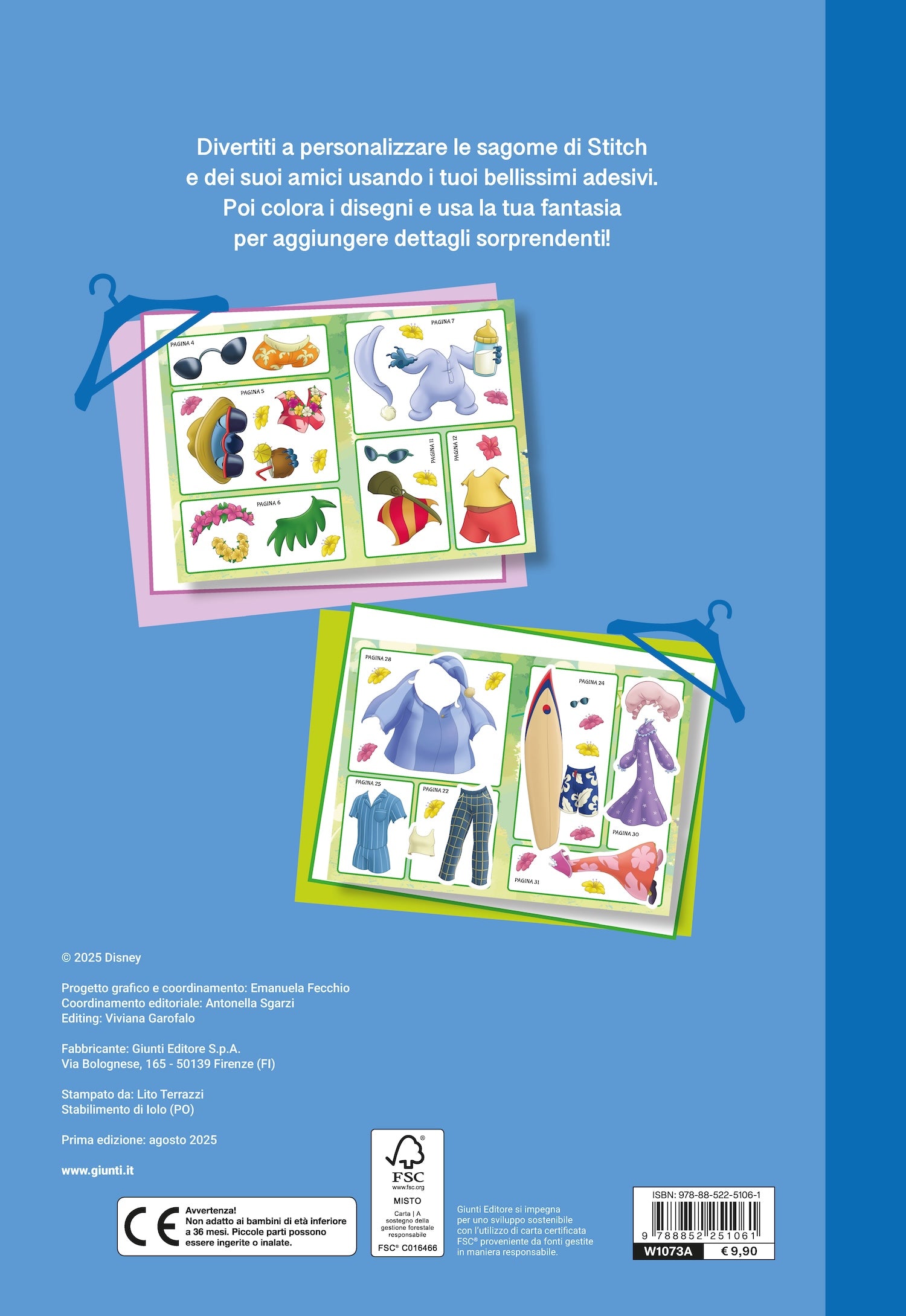 Libro con abiti e accessori da incollare sui personaggi di Lilo&Stitch, con attività di coloring.