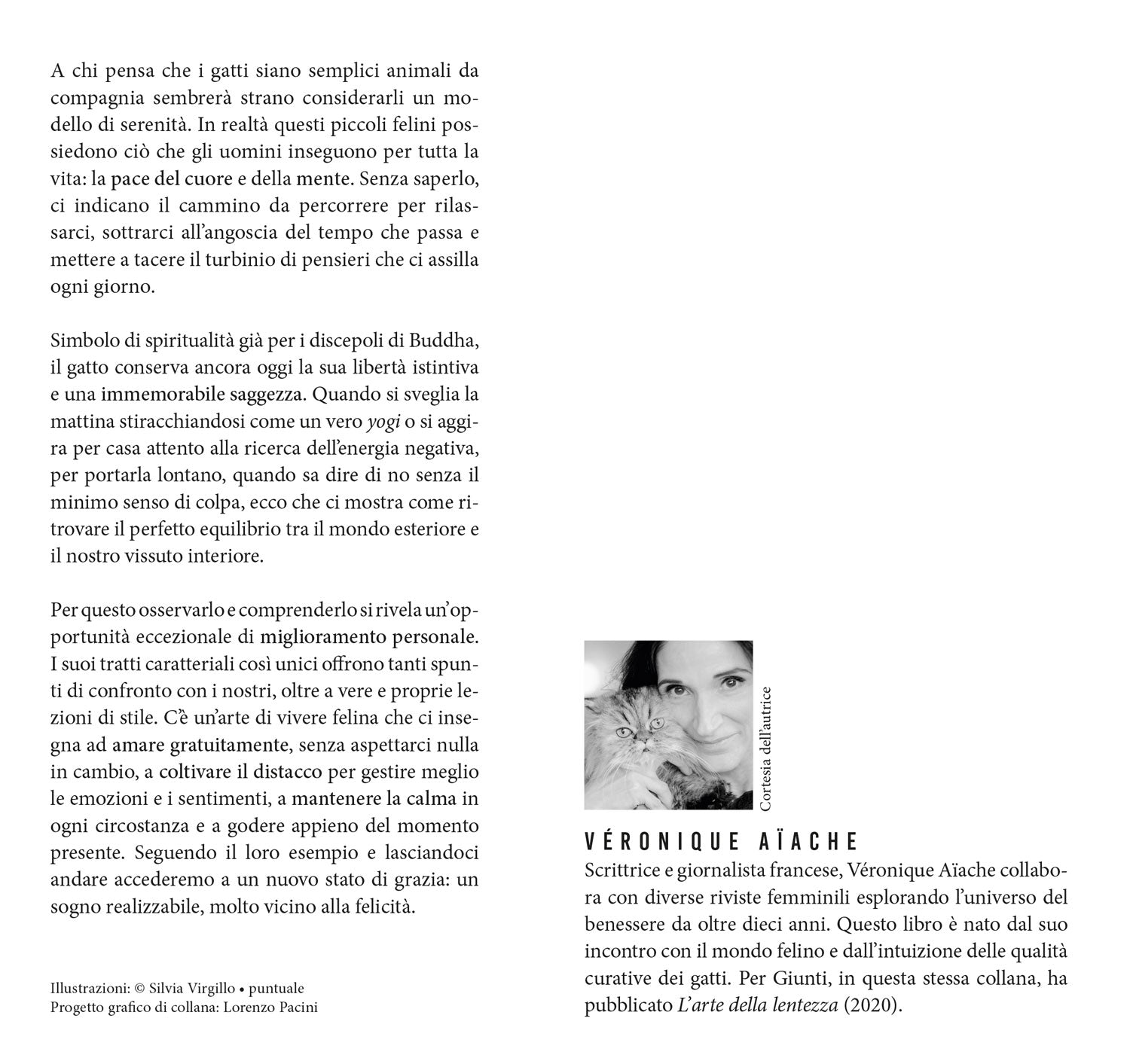 A chi pensa che i gatti siano semplici animali da compagnia sembrerà strano considerarli un modello di serenità. In realtà questi piccoli felini possiedono ciò che gli uomini inseguono per tutta la vita: la pace del cuore e della mente. Senza saperlo, ci indicano il cammino da percorrere per rilassarci, sottrarci all’angoscia del tempo che passa e mettere a tacere il turbinio di pensieri che ci assilla ogni giorno. Simbolo di spiritualità già per i discepoli di Buddha, il gatto conserva ancora oggi la sua libertà istintiva e la sua immemorabile saggezza. Quando si sveglia la mattina stiracchiandosi come un vero yogi o si aggira per casa attento, alla ricerca dell’energia negativa per portarla lontano, quando sa dire di no senza il minimo senso di colpa, ecco che ci mostra come vivere per ritrovare un equilibrio perfetto tra il mondo esteriore e il nostro vissuto interiore. Per questo osservarlo e comprenderlo ci offre un’opportunità eccezionale di miglioramento personale. I suoi tratti caratteriali così unici offrono tanti spunti di confronto con i nostri, oltre a vere e proprie lezioni di stile. C’è un’arte di vivere felina che ci insegna ad amare gratuitamente, senza aspettarci nulla in cambio, a coltivare il distacco per circoscrivere meglio le emozioni o i sentimenti, a mantenere la calma in ogni circostanza e a godere appieno del momento presente. Seguendo il loro esempio e lasciandoci andare accederemo a un nuovo stato di grazia: un sogno realizzabile, molto vicino alla felicità.