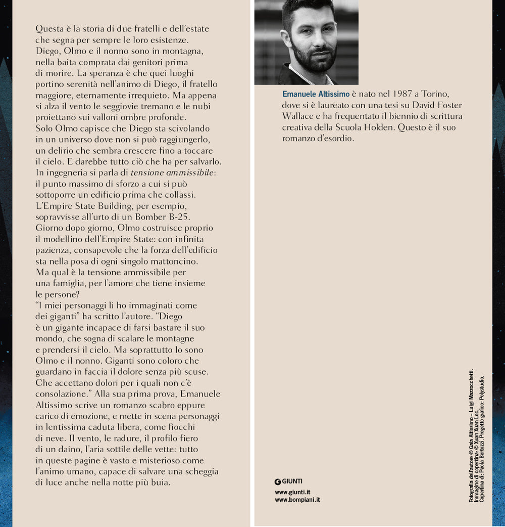 Questa è la storia di due fratelli e dell’estate che segna per sempre le loro esistenze. Diego, Olmo e il nonno sono in montagna, nella baita comprata dai genitori prima di morire. La speranza è che quei luoghi portino serenità nell’animo di Diego, il fratello maggiore, eternamente irrequieto. Ma appena si alza il vento le seggiovie tremano e le nubi proiettano sui valloni ombre profonde. Solo Olmo capisce che Diego sta scivolando in un universo dove non si può raggiungerlo, un delirio che sembra crescere fino a toccare il cielo. E darebbe tutto ciò che ha per salvarlo. In ingegneria si parla di tensione ammissibile: il punto massimo di sforzo a cui si può sottoporre un edificio prima che collassi. L’Empire State Building, per esempio, sopravvisse all’urto di un Bomber B-25. Giorno dopo giorno, Olmo costruisce proprio il modellino dell’Empire State: con infinita pazienza, consapevole che la forza dell’edificio sta nella posa di ogni singolo mattoncino. Ma qual è la tensione ammissibile per una famiglia, per l’amore che tiene insieme le persone? “I miei personaggi li ho immaginati come dei giganti” ha scritto l’autore. “Diego è un gigante incapace di farsi bastare il suo mondo, che sogna di scalare le montagne e prendersi il cielo. Ma soprattutto lo sono Olmo e il nonno. Giganti sono coloro che guardano in faccia il dolore senza più scuse. Che accettano dolori per i quali non c’è consolazione.” Alla sua prima prova, Emanuele Altissimo scrive un romanzo scabro eppure carico di emozione, e mette in scena personaggi in lentissima caduta libera, come fiocchi di neve. Il vento, le radure, il profilo fiero di un daino, l’aria sottile delle vette: tutto in queste pagine è vasto e misterioso come l’animo umano, capace di salvare una scheggia di luce anche nella notte più buia.