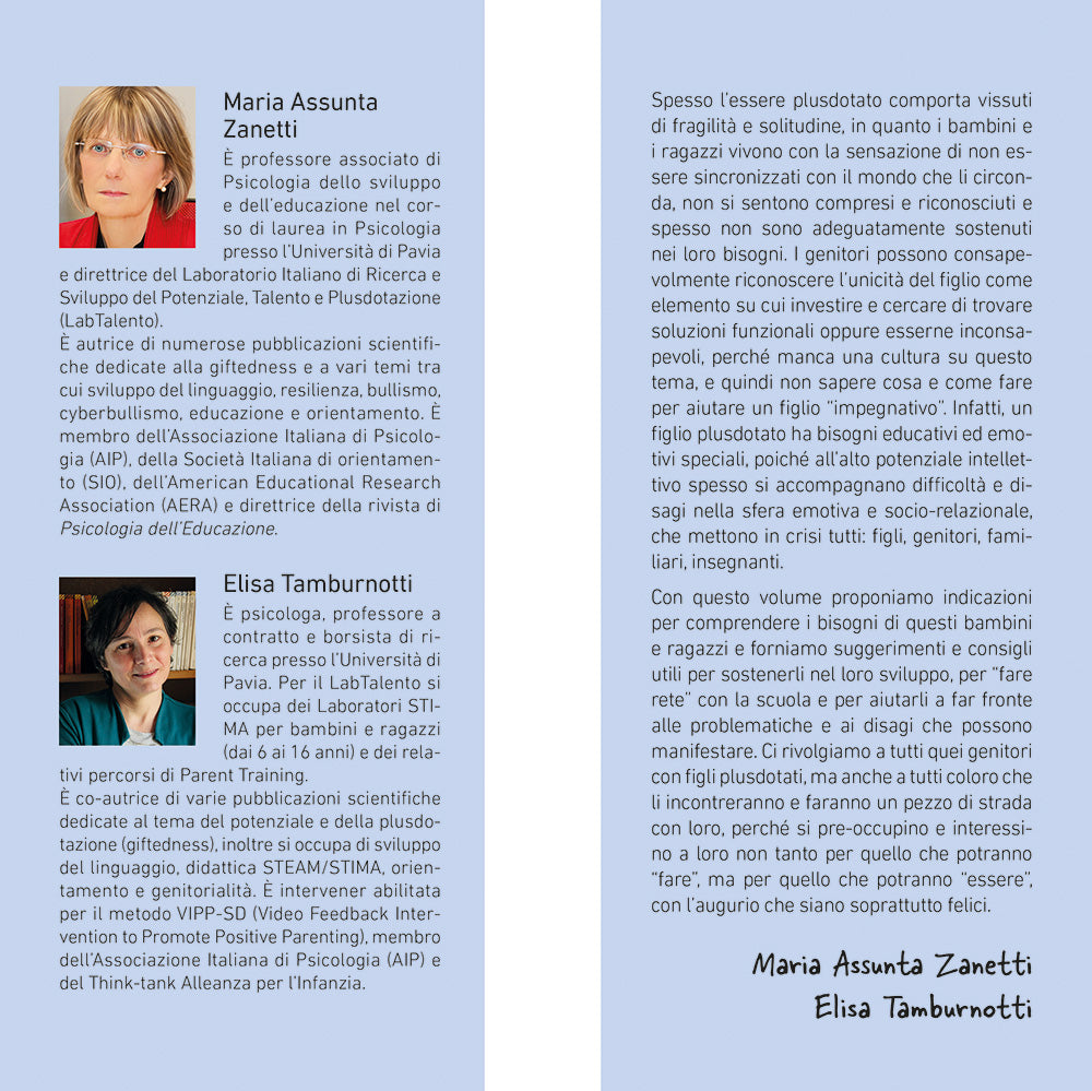 "Spesso l’essere plusdotato comporta vissuti di fragilità e solitudine, in quanto i bambini e i ragazzi vivono con la sensazione di non essere sincronizzati con il mondo che li circonda, non si sentono compresi e riconosciuti e spesso non sono adeguatamente sostenuti nei loro bisogni. I genitori possono consapevolmente riconoscere l’unicità del figlio come elemento su cui investire e cercare di trovare soluzioni funzionali oppure esserne inconsapevoli, perché manca una cultura su questo tema, e quindi non sapere cosa e come fare per aiutare un figlio “impegnativo”. Infatti, un figlio plusdotato ha bisogni educativi ed emotivi speciali, poiché all’alto potenziale intellettivo spesso si accompagnano difficoltà e disagi nella sfera emotiva e socio-relazionale, che mettono in crisi tutti: figli, genitori, familiari, insegnanti. Con questo volume proponiamo indicazioni per comprendere i bisogni di questi bambini e ragazzi e forniamo suggerimenti e consigli utili per sostenerli nel loro sviluppo, per “fare rete” con la scuola e per aiutarli a far fronte alle problematiche e ai disagi che possono manifestare. Ci rivolgiamo a tutti quei genitori con figli plusdotati, ma anche a tutti coloro che li incontreranno e faranno un pezzo di strada con loro, perché si pre-occupino e interessino a loro non tanto per quello che potranno “fare”, ma per quello che potranno “essere”, con l’augurio che siano soprattutto felici."