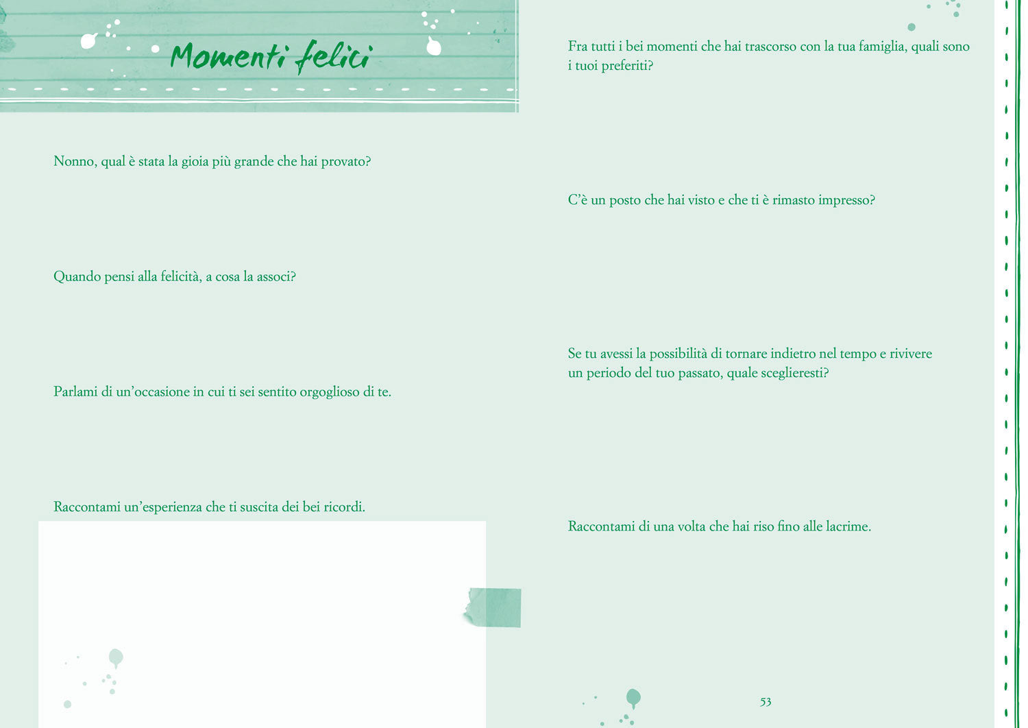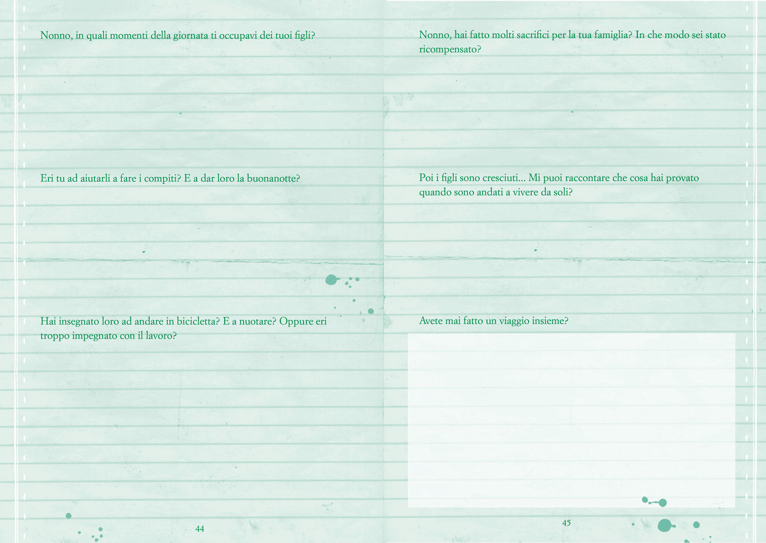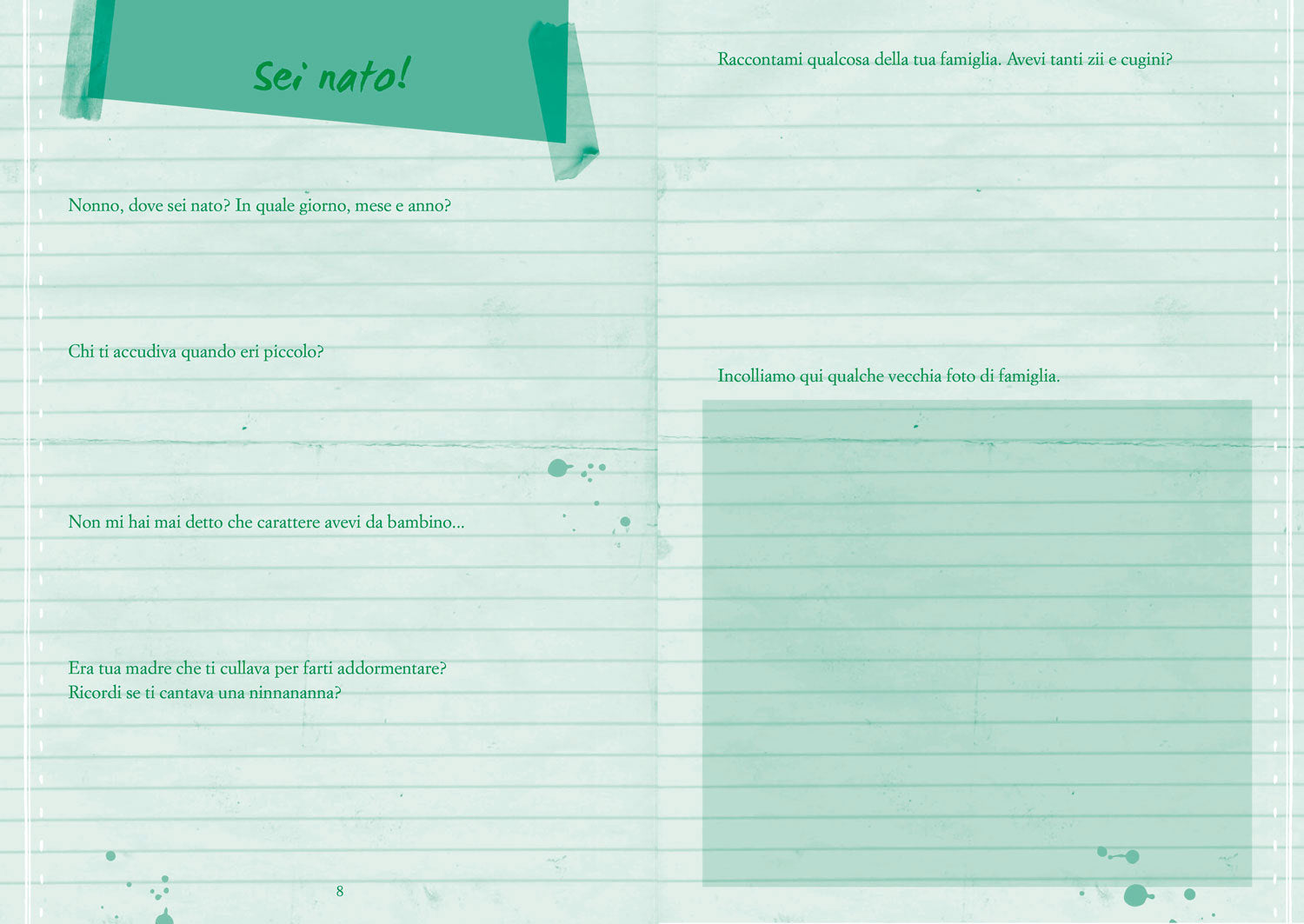 Questo è un libro speciale, un libro tutto da scrivere. Nelle sue pagine ci sono tante domande da porre al nonno, per conoscere la sua vita e tramandarne il racconto.