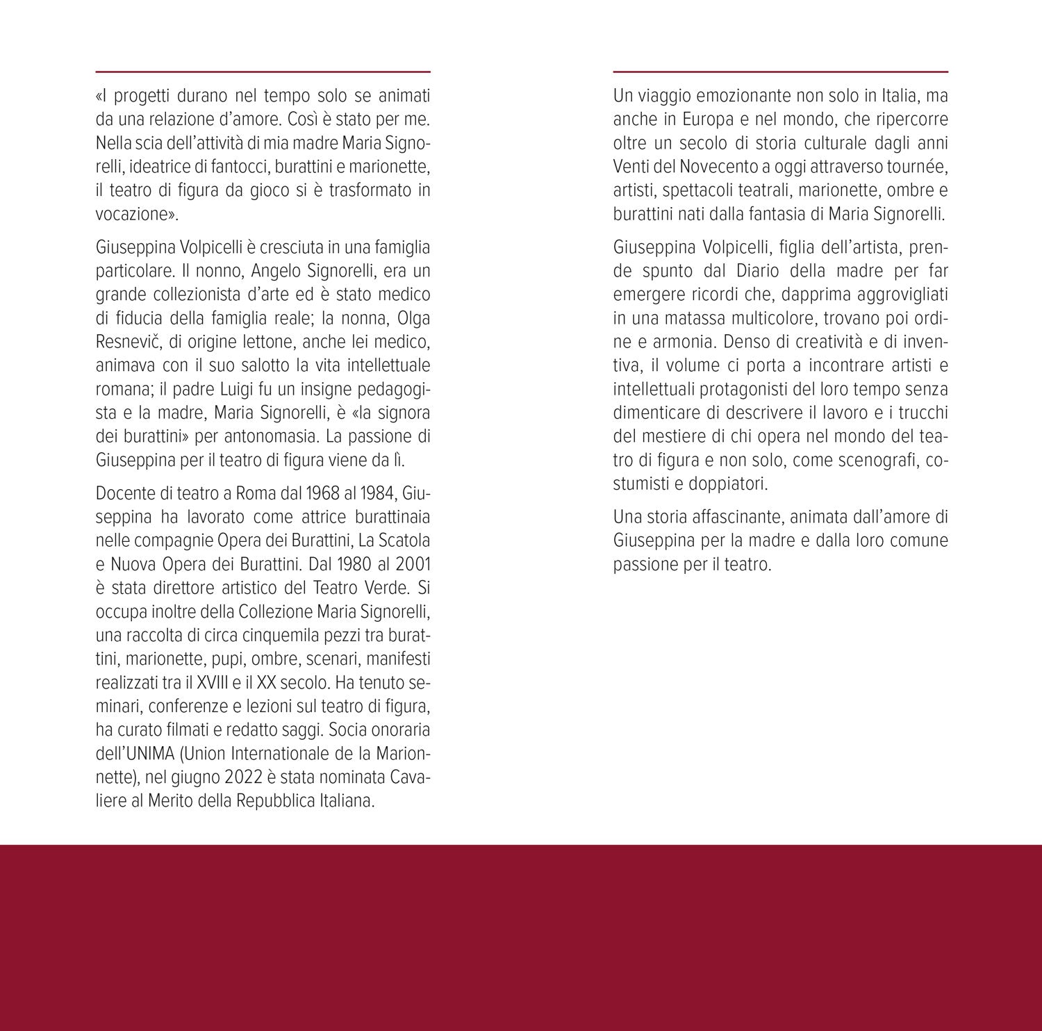 Un viaggio emozionante in Italia, in Europa e nel mondo che, attraverso tournée, spettacoli teatrali, artisti, marionette, burattini e ombre ripercorre oltre un secolo di storia culturale dagli anni Venti del Novecento a oggi. Denso di creatività e fantasia, il volume ci porta a incontrare artisti e intellettuali, ognuno protagonista del proprio tempo. Senza dimenticare di descrivere il lavoro e i trucchi del mestiere di chi opera nel mondo del teatro di figura e non, come scenografi, costumisti e doppiatori. Il libro prende spunto dal diario di Maria Signorelli, dal quale emergono ricordi che, dapprima aggrovigliati in una matassa multicolore, trovano poi ordine e armonia. Un volume affascinante, scritto da Giuseppina Volpicelli e animato dall’amore per la madre e dalla passione per il teatro.