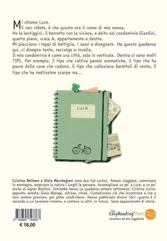 Mi chiamo Luce. E non ridete, è che questo era il nome di mia nonna. Ho le lentiggini, il berretto con la visiera, e abito nel condominio Giardini, quarto piano, scala A, appartamento a destra. Mi piacciono i tappi di bottiglia, i sassi e disegnare. Ho questo quaderno qui, ci disegno tanto, raccolgo e incollo. Il mio condominio è come una città, solo in verticale. Dentro ci sono molti TIPI. Per esempio, il tipo che coltiva parole aromatiche, il tipo che ha paura delle cose che cadono, il tipo che colleziona barattoli di vento, il tipo che ha moltissime scarpe ma…