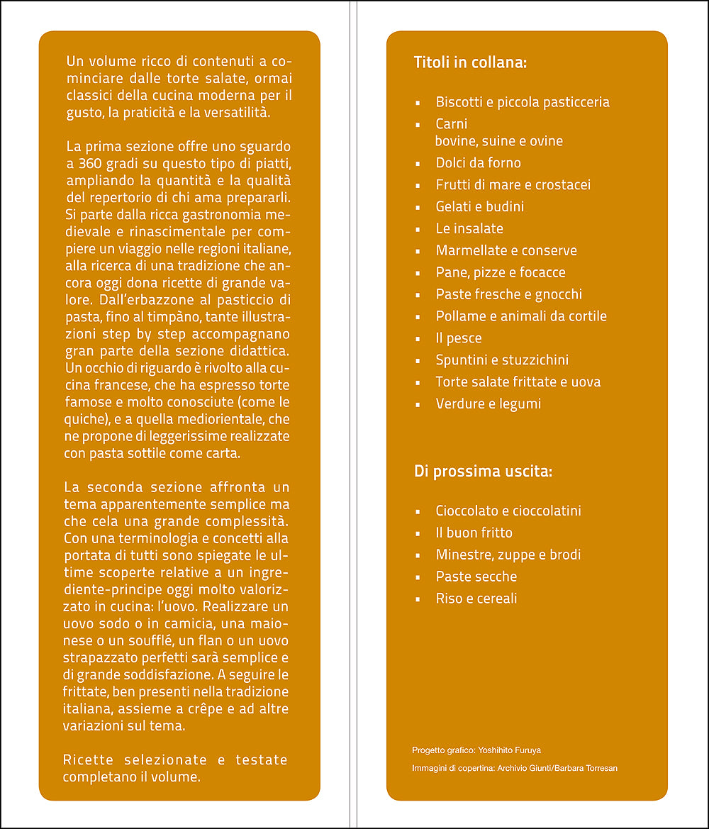Una scuola e tante ricette firmate Slow Food di preparazioni tipiche della cucina italiana; le uova, in tutte le loro varianti, e le torte salate più gustose. Slow Food firma un libro di ricette di cucina italiana che spaziano dalle uova alle torte salate alle frittate, ma non solo: il libro è anche una scuola di cucina per imparare, e piano piano perfezionare, le proprie competenze. Sotto la guida di autori di grande professionalità e con il particolare taglio della filosofia Slow Food (buono, pulito giusto), chiunque potrà imparare tutte le tecniche e gli accorgimenti necessari. Perché in cucina bisogna sperimentare, ma dopo aver consolidato una buona manualità. Ecco quindi tante ricette gustose spiegate con foto step by step per riscoprire la tradizione italiana, con incursioni in quella francese per quanto riguarda le torte salate. Dalla collaborazione tra Giunti e Slow Food nasce questa Scuola di Cucina pensata per tutti coloro che vogliono imparare sentendosi garantiti, non intimoriti, dall'autorevolezza di un marchio come Slow Food e dai suoi autori. Con uno stile divulgativo e grazie a un apparato iconografico molto ricco, vengono spiegati con testi e immagini, passo dopo passo, i gesti e i valori della cucina tradizionale italiana, proponendo moltissime realizzazioni che arrivano da tutto il territorio, integrate da box di approfondimento e arricchite da un nutrito apparato di ricette.
