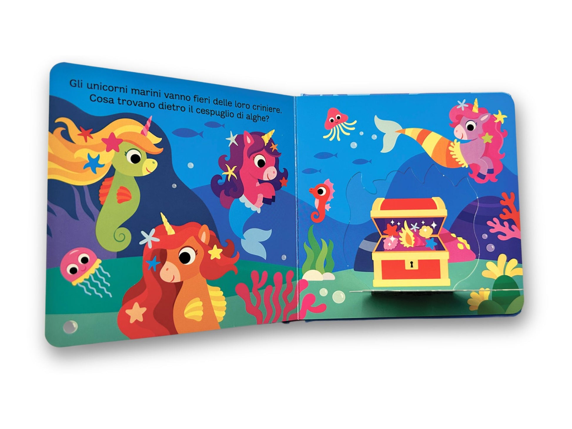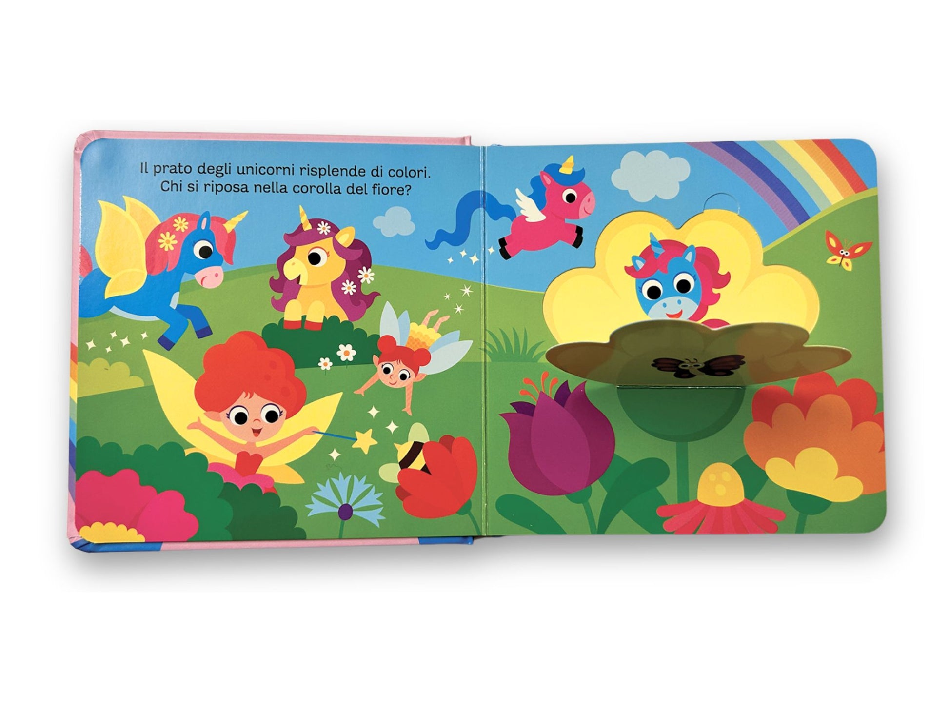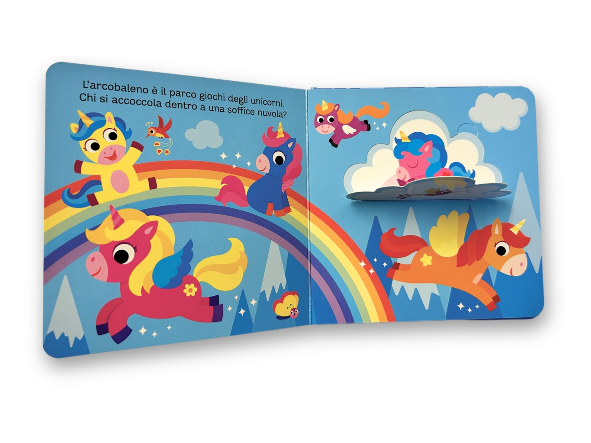 Un volume dal formato adatto alle piccole mani, illustrazioni ricche e coloratissime con tante finestrelle da sollevare per scoprire chi si nasconde sotto… vieni a esplorare il fantastico mondo degli unicorni, tante sorprese ti attendono!